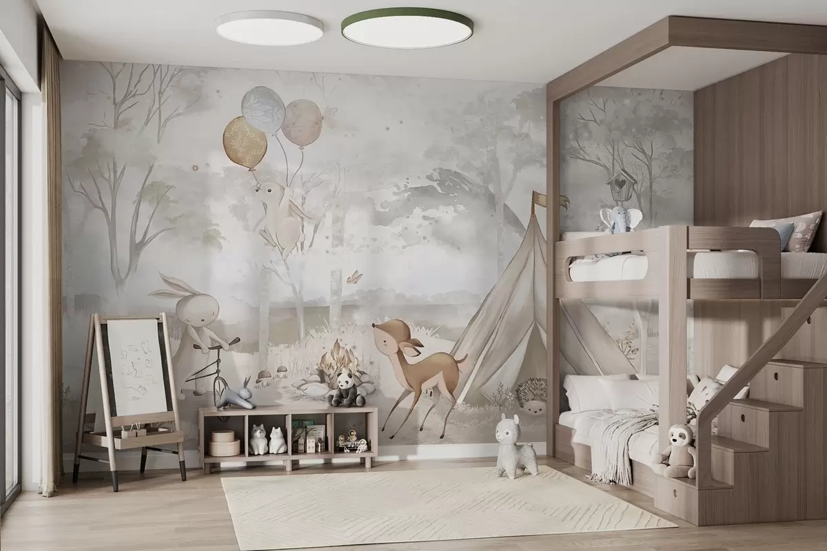 Stenske poslikave Otroški kamp v toplih bež tonih, šotor in gozdne živali Št. w04671