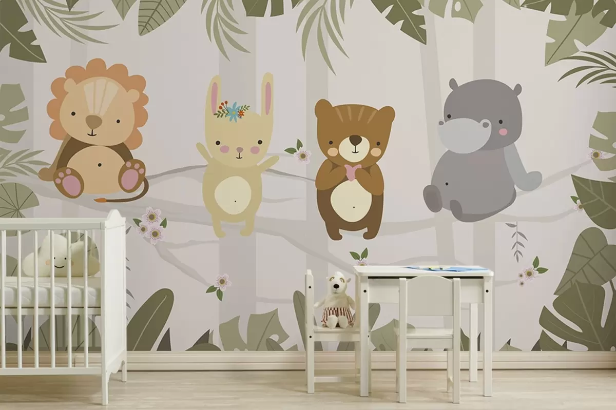 Stenske poslikave Simpatični lev, zajček, medved in povodni konj med listjem Št. w04682