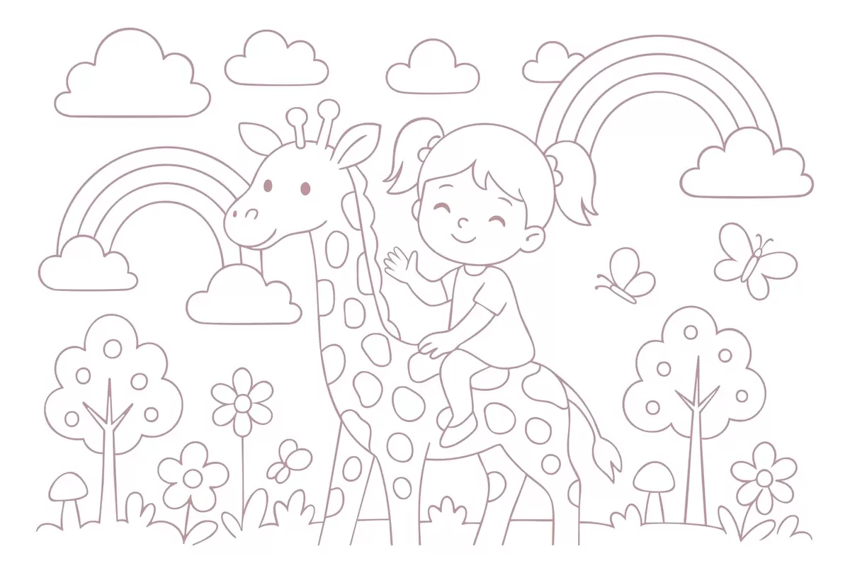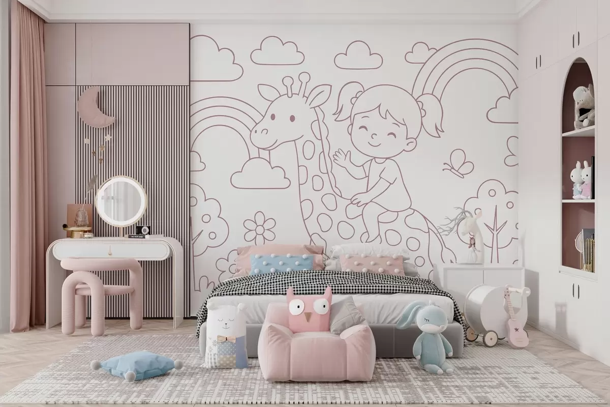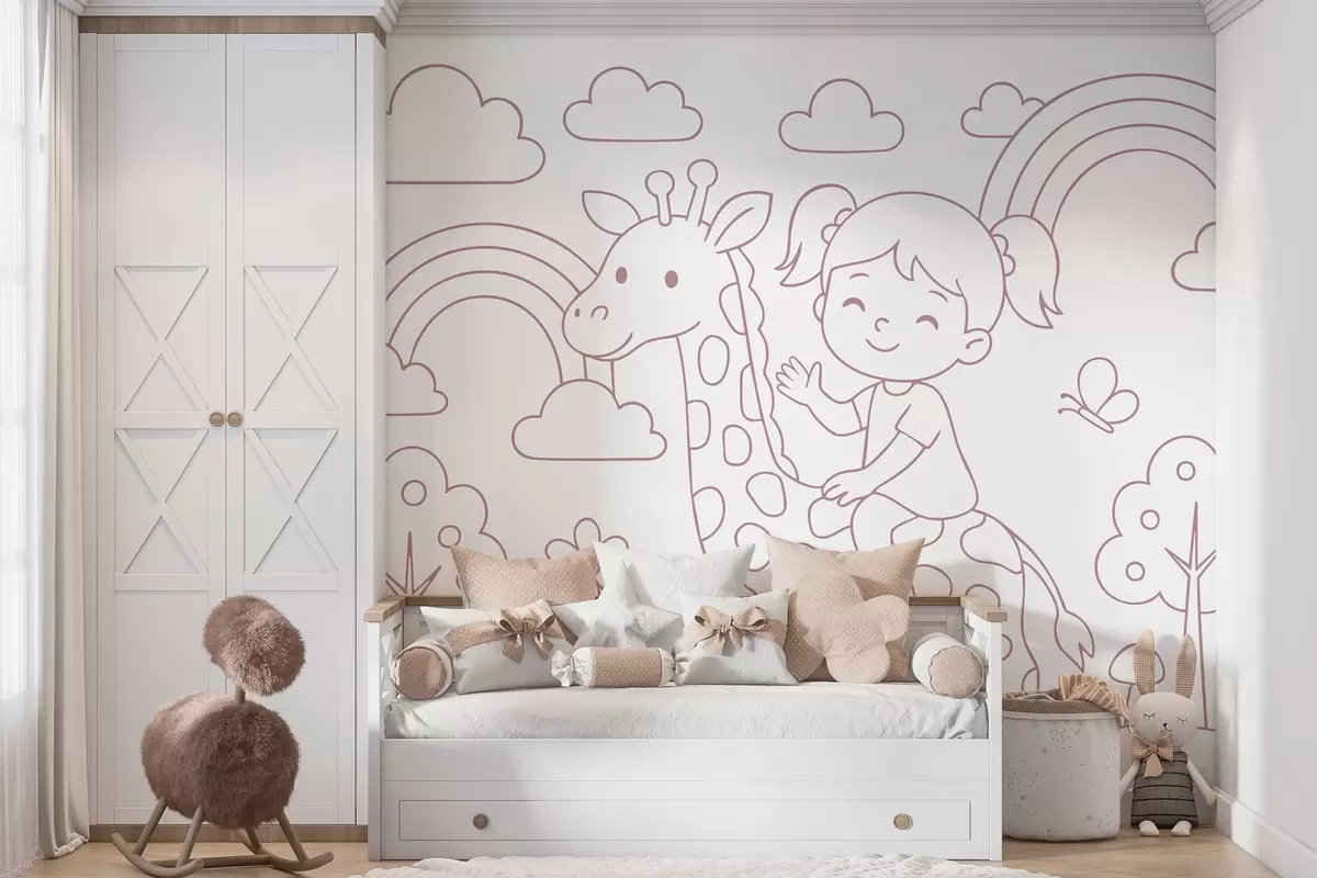 Stenske poslikave slikarija v prahu deklice na žirafi v slogu otroške pobarvank Št. w04753v1