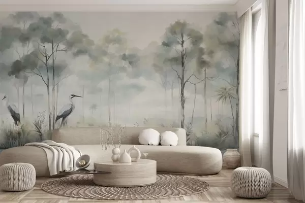 Stenske poslikave Meglen gozd ob vodi s čapljami, mehka hladna paleta Št. w04788