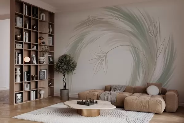 Stenske poslikave zelene in bež perje in cvetje, ročno poslikano Št. w04816