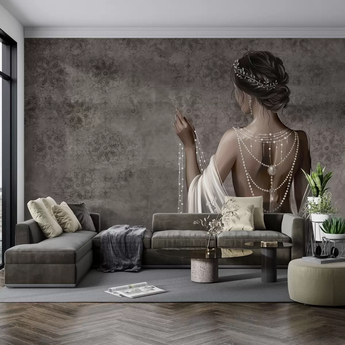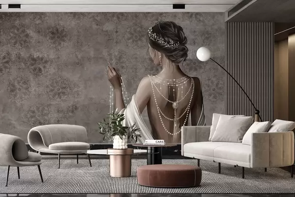 Stenske poslikave Ženska, vidna od zadaj, z biseri, sivo ozadje z vzorcem kamna Št. w04854
