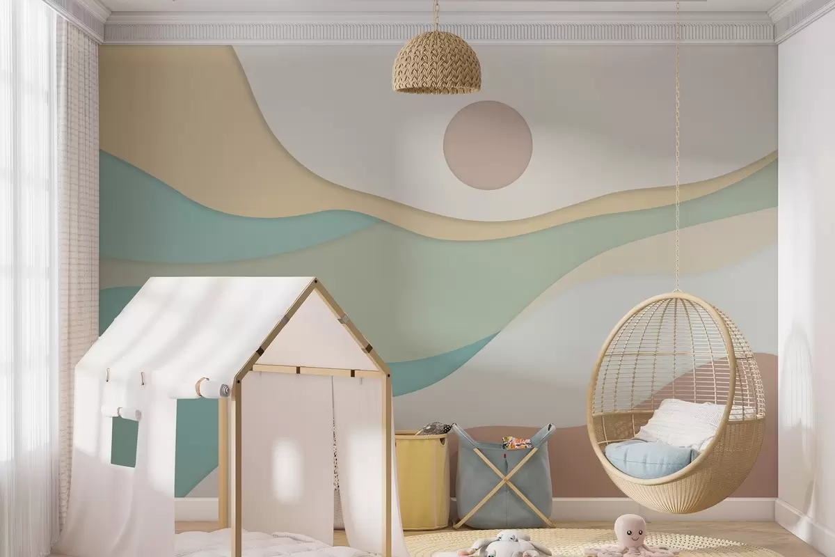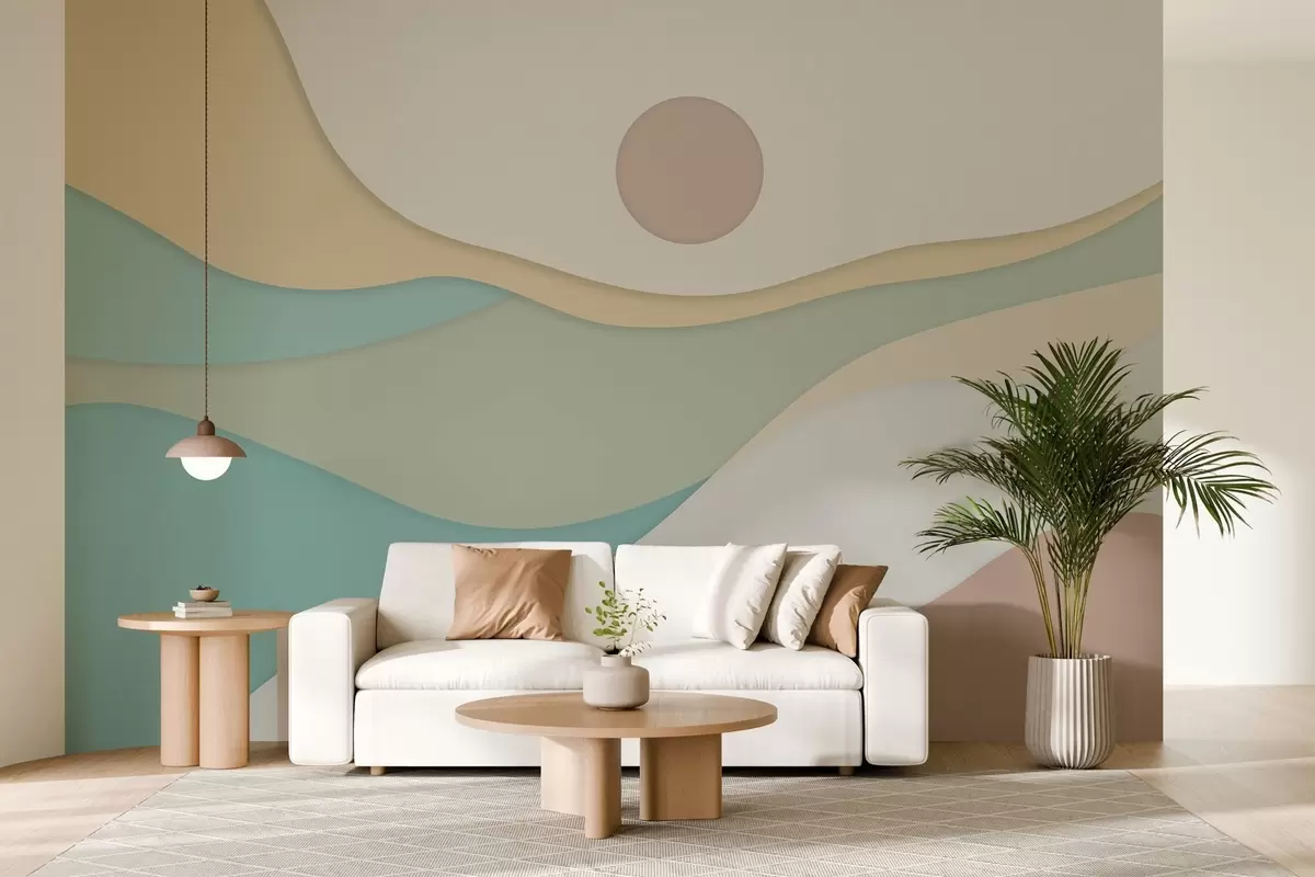 Stenske poslikave Minimalistična abstrakcija z mehkimi, valovitimi oblikami, ki spominjajo na valovite pokrajine in sipine. Št. w04874