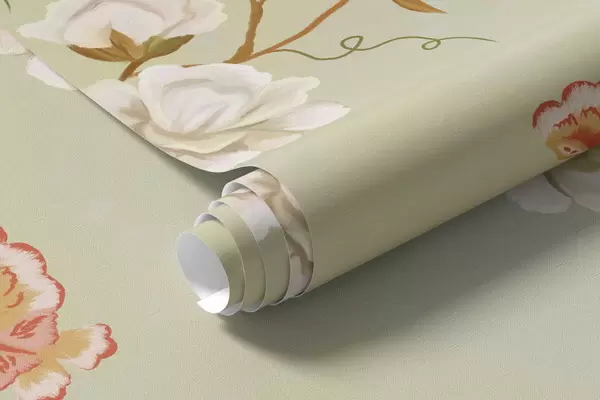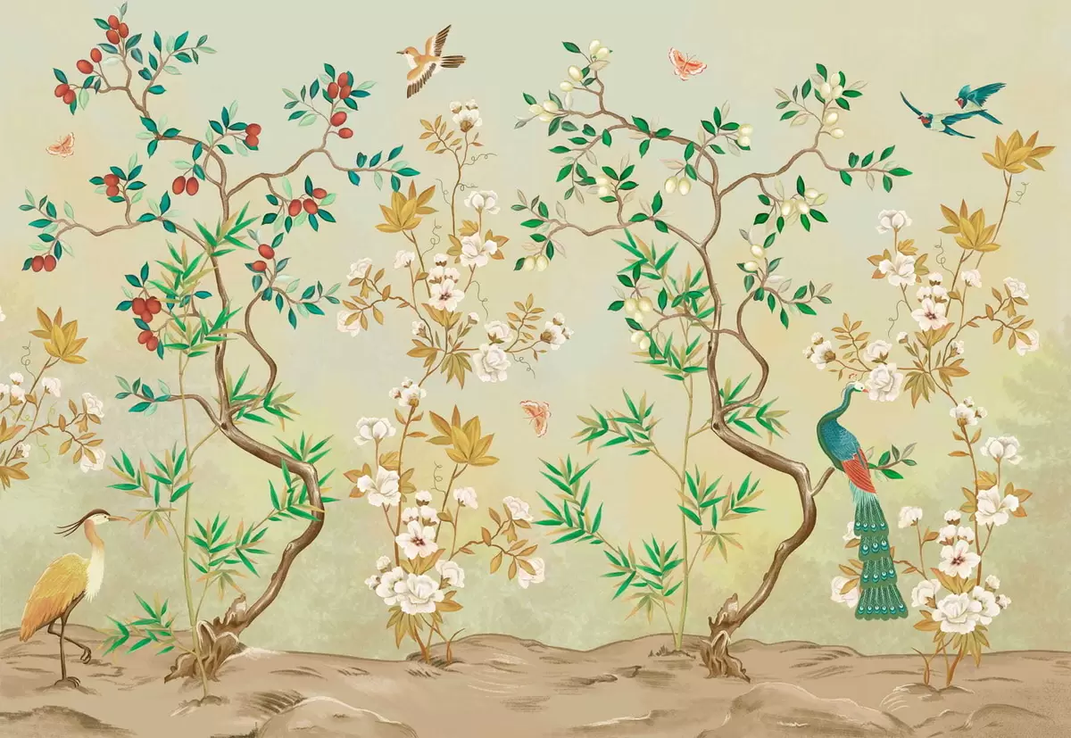 Stenske poslikave Prizor z drevesi, cvetjem in pticami, svetlo ozadje Št. w05004v1