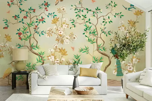 Stenske poslikave Prizor z drevesi, cvetjem in pticami, svetlo ozadje Št. w05004v1