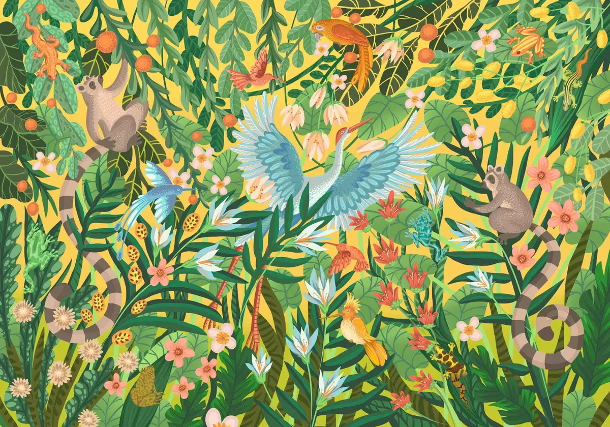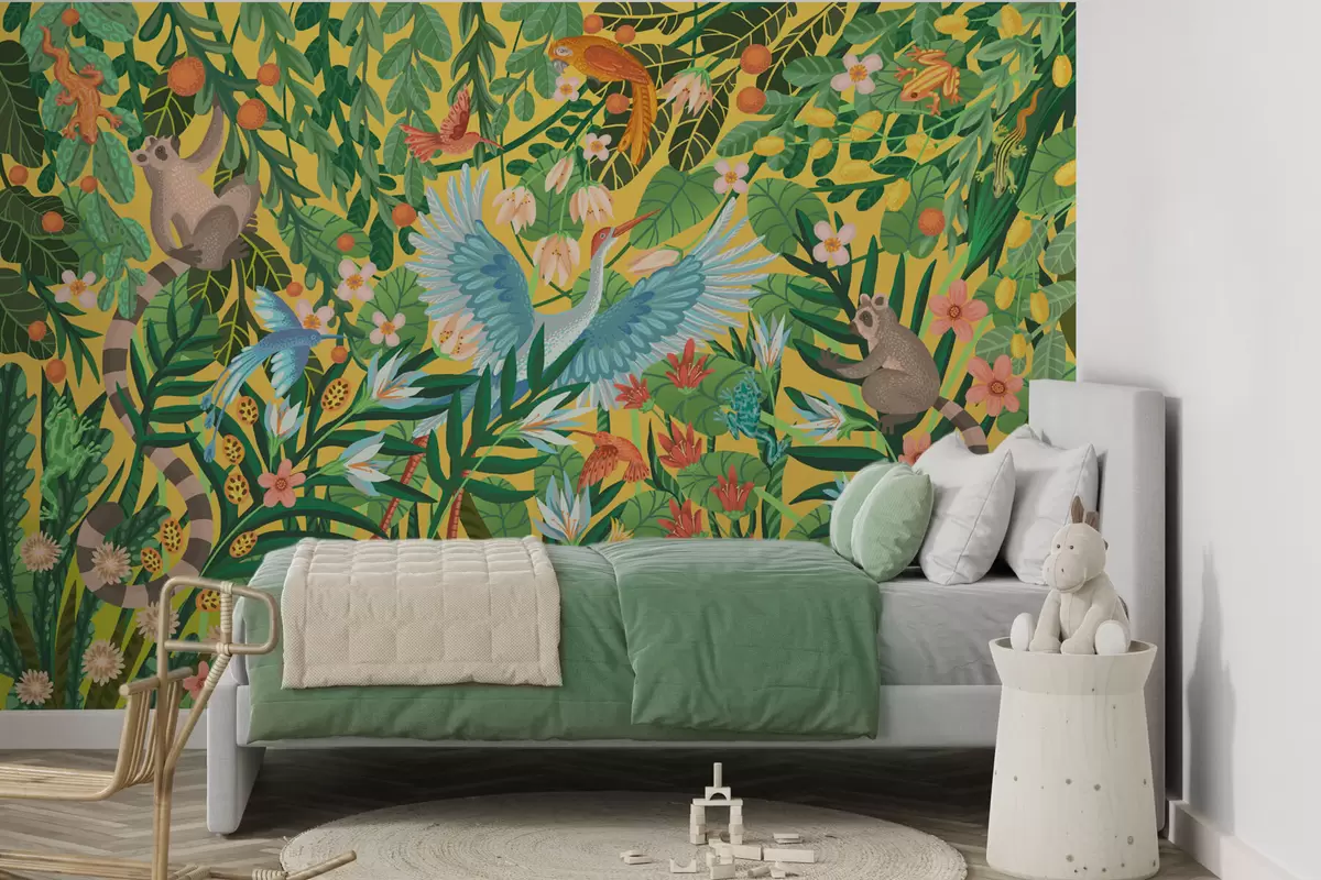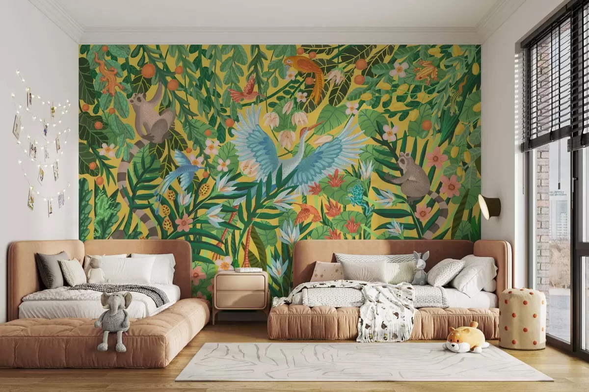 Stenske poslikave Svetla scena s pticami in živalmi v gosti zeleni Št. w05024v1