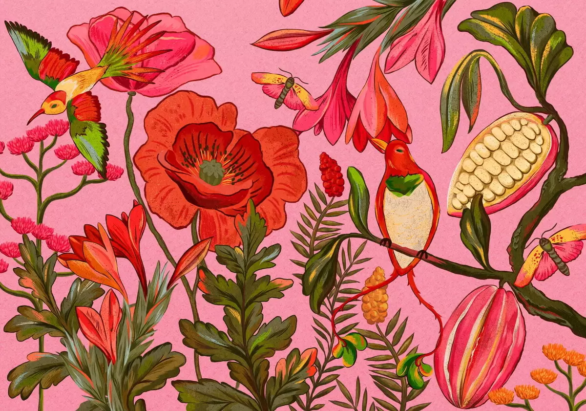 Stenske poslikave Dekorativne rože in ptice na rožnatem ozadju Št. w05036v2