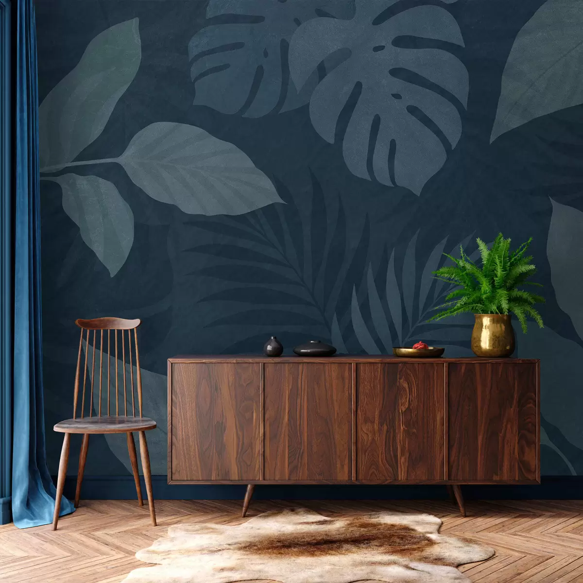 Stenske poslikave teksturirani tropski listi na temno modrem ozadju Št. w05063v3