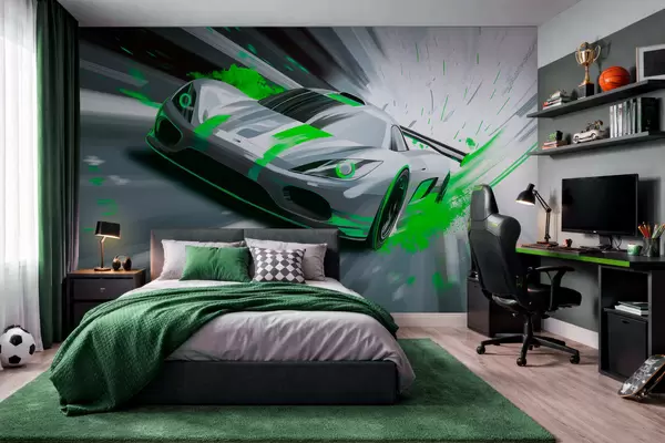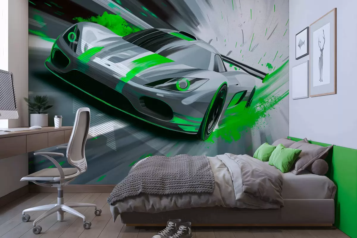 Stenske poslikave dinamičen športni avtomobil v digitalnem risarskem slogu z zelenimi poudarki Št. w05069v4