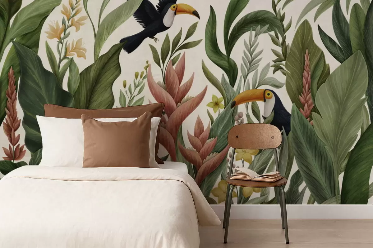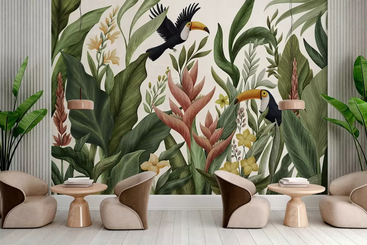 Stenske poslikave Tropsko listje in ptice z velikimi kljuni na temnem ozadju Št. w05088v1