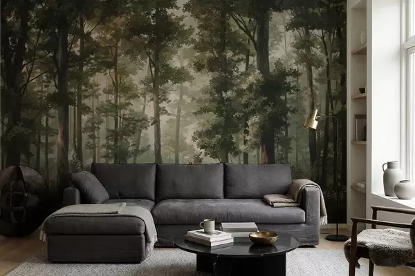 stenske poslikave Ilustracija gozda z meglo, visokimi drevesi in potjo w05089