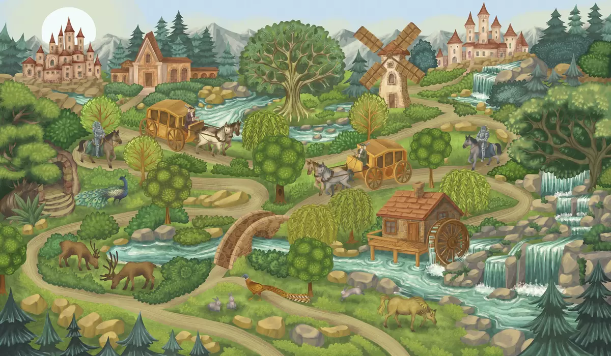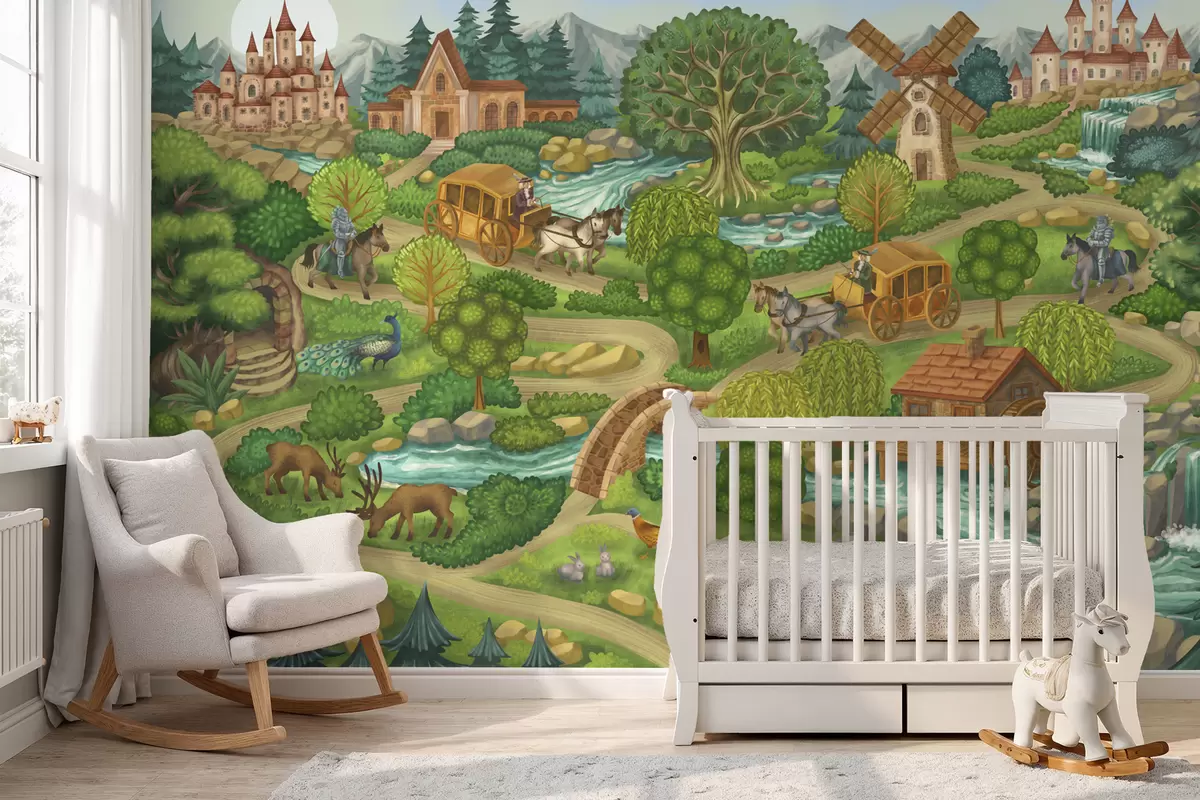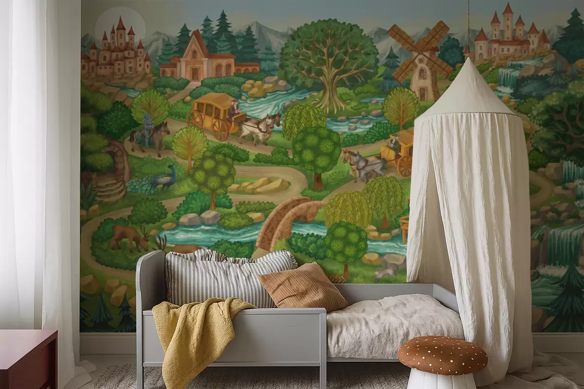 Stenske poslikave Ilustracija pravljičnega sveta z gradovi, gozdovi, rekami in popotniki Št. w05091v1
