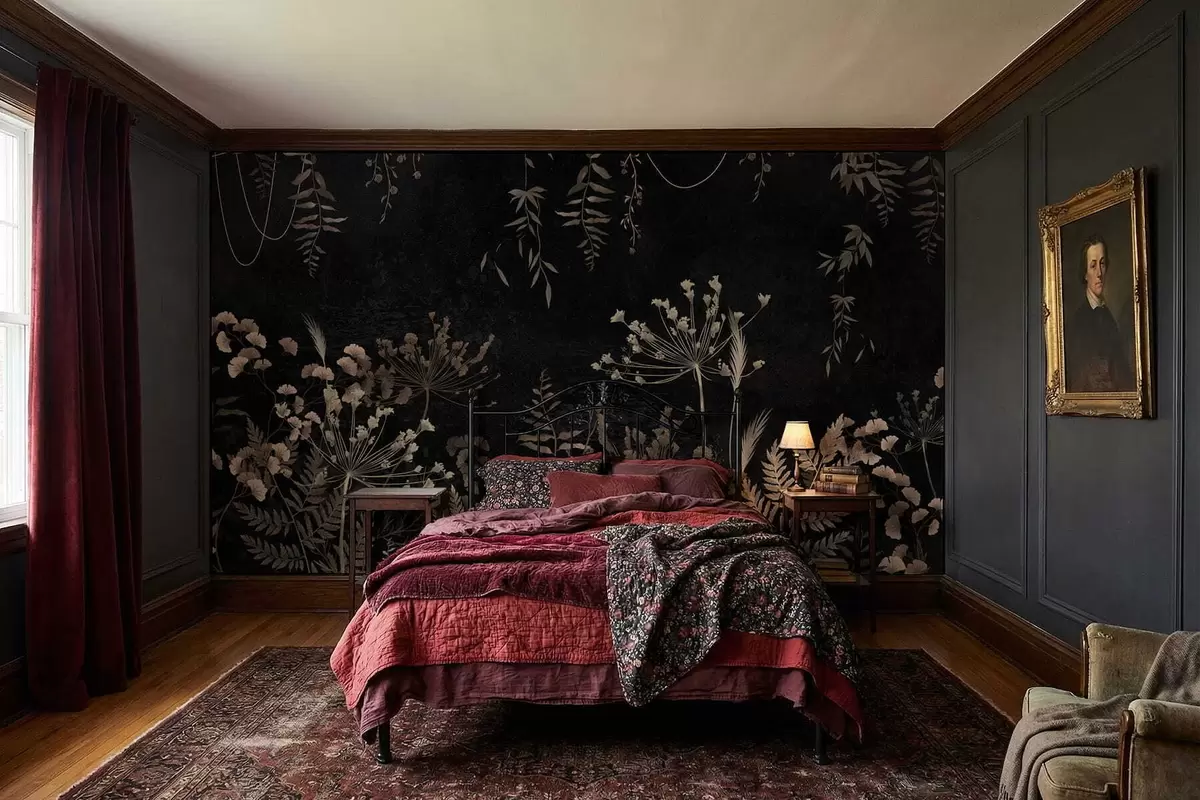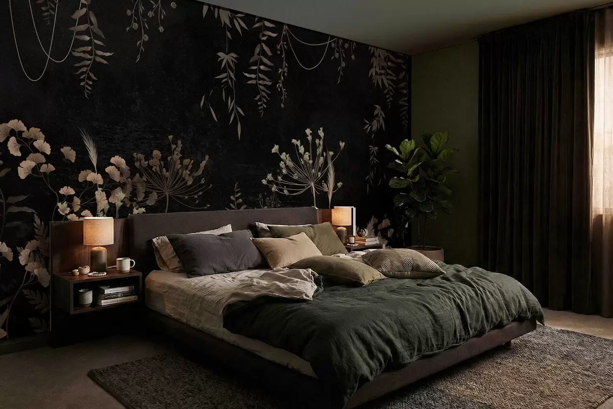 Stenske poslikave Temni botanični vzorec s cvetovi in listi Št. w05092