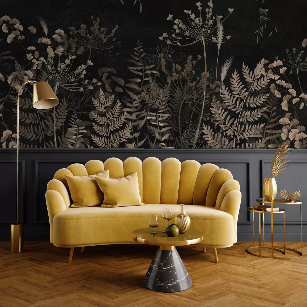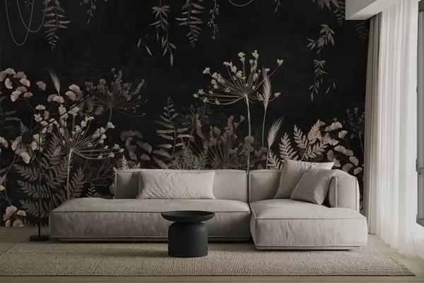 Stenske poslikave Temni botanični vzorec s cvetovi in listi Št. w05092