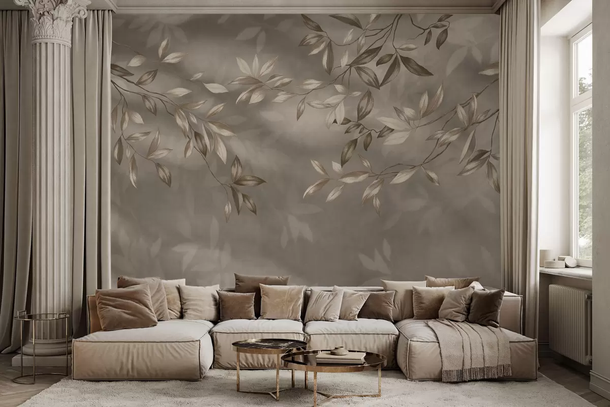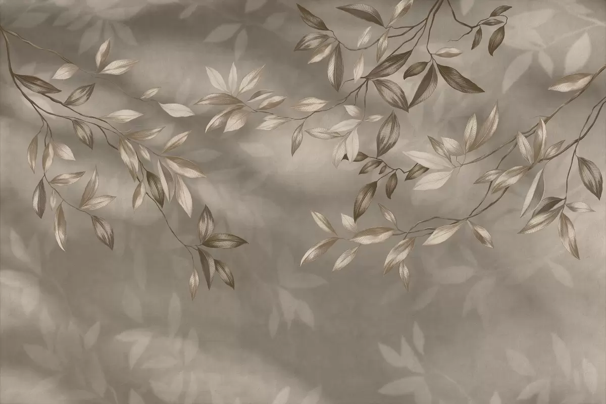 Stenske poslikave Nežne listnate veje v bež barvah na svetlem ozadju Št. w05113v2