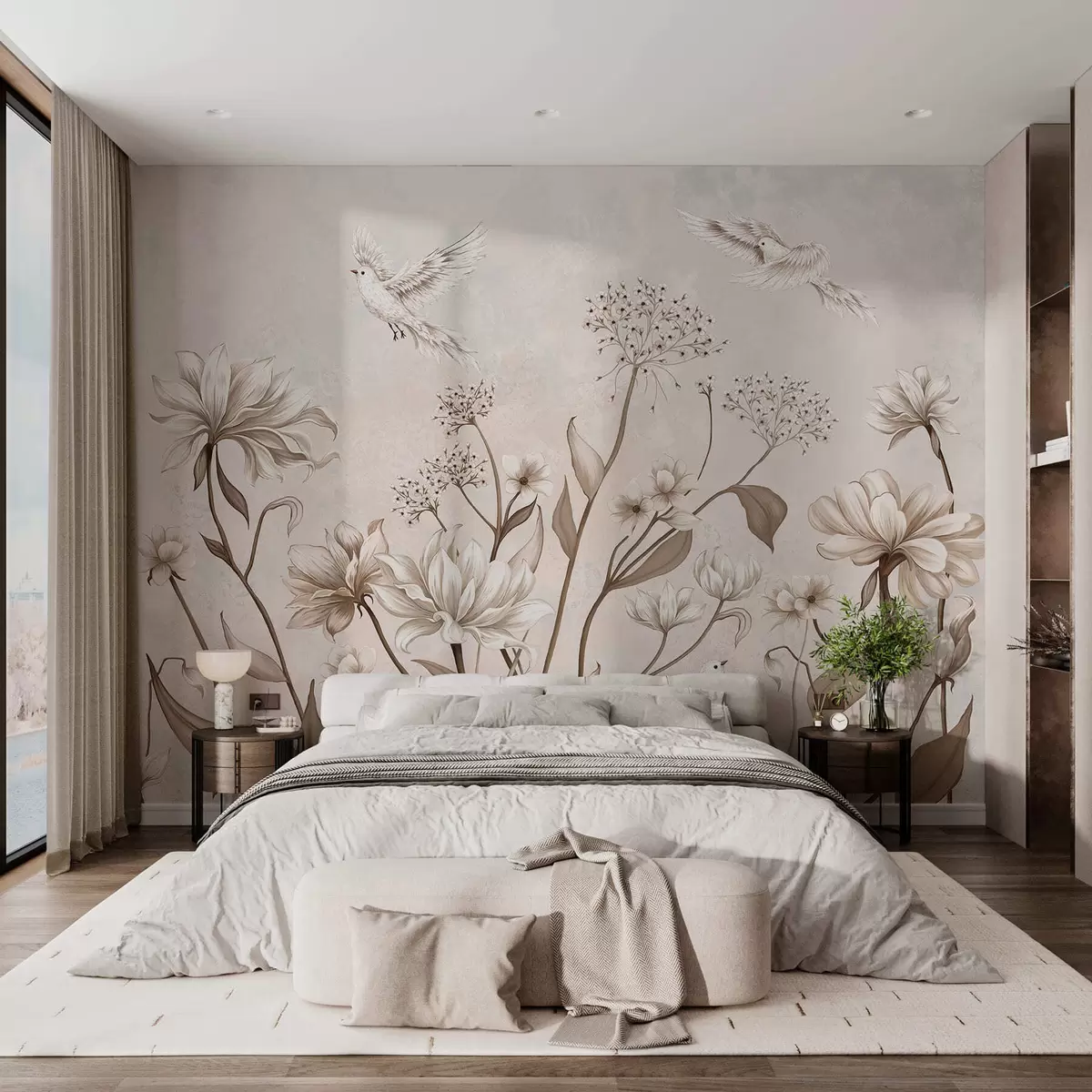 Stenske poslikave Svetli cvetovi in ptice na nežnem ozadju Št. w05118