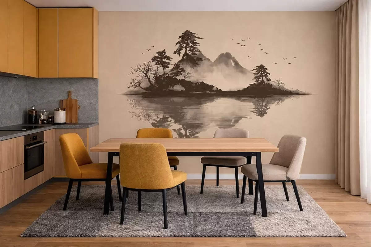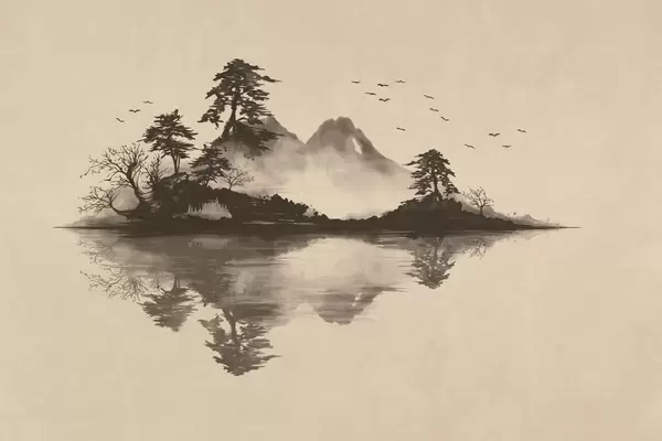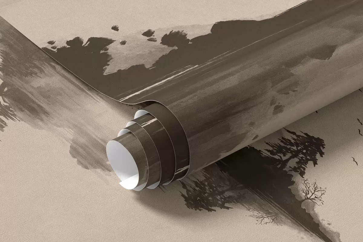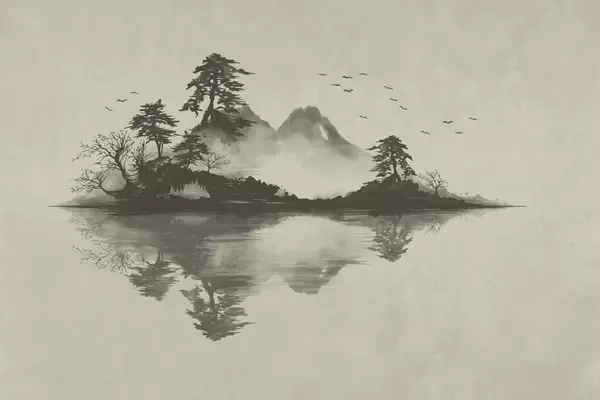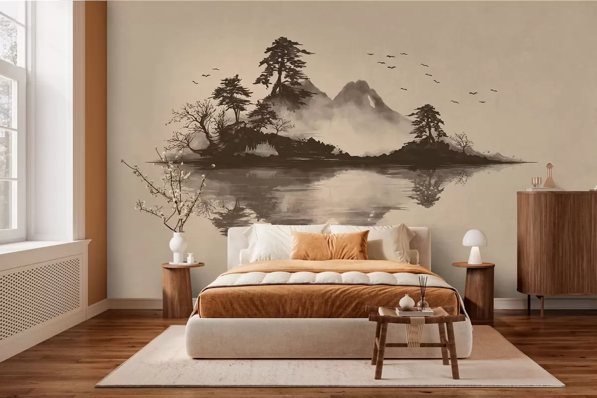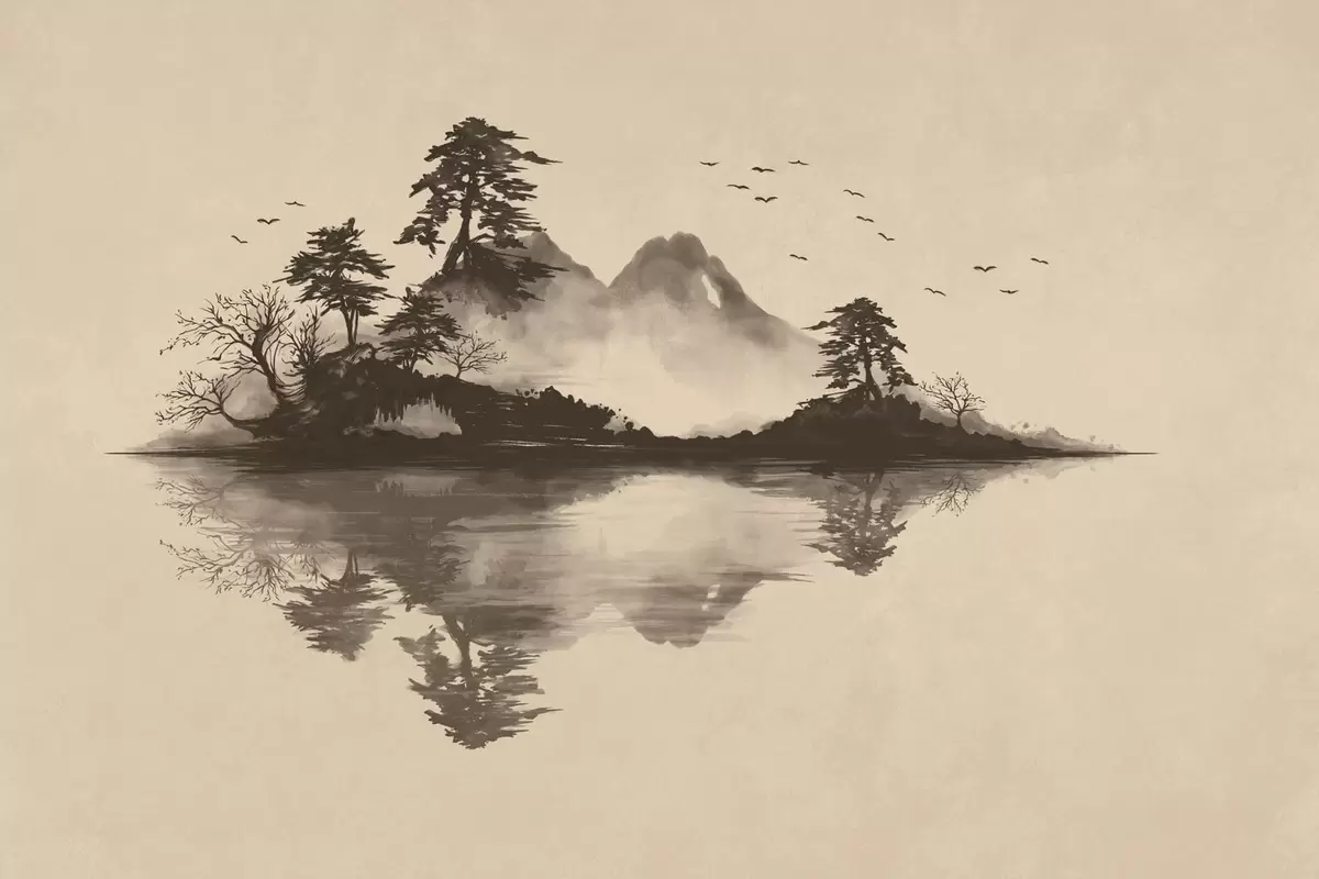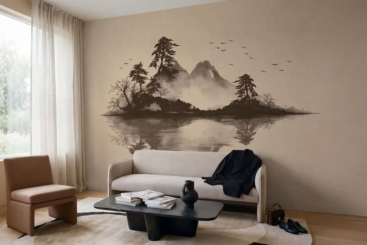 Stenske poslikave Gorska pokrajina v slogu sumi-e z borovci in odsevom Št. w05124