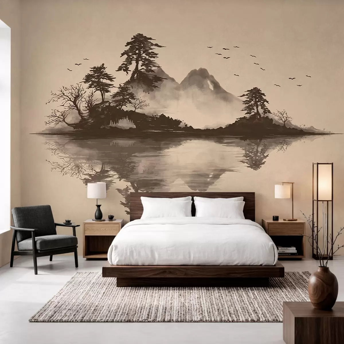 Stenske poslikave Gorska pokrajina v slogu sumi-e z borovci in odsevom Št. w05124