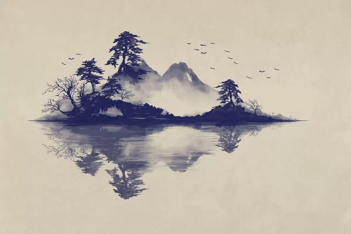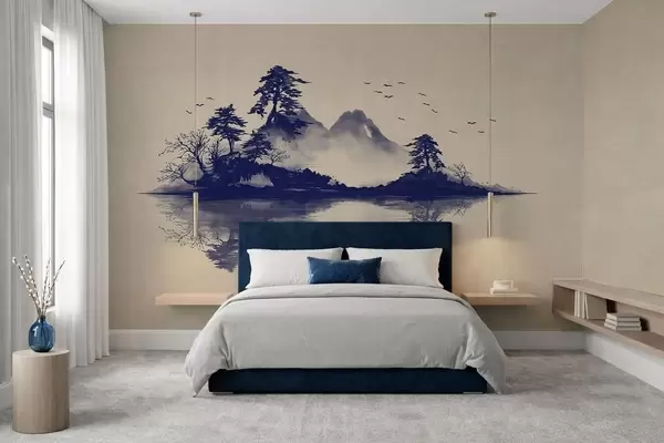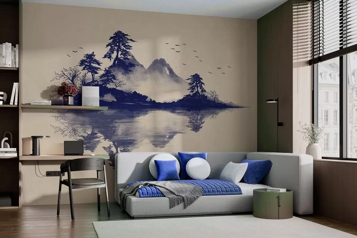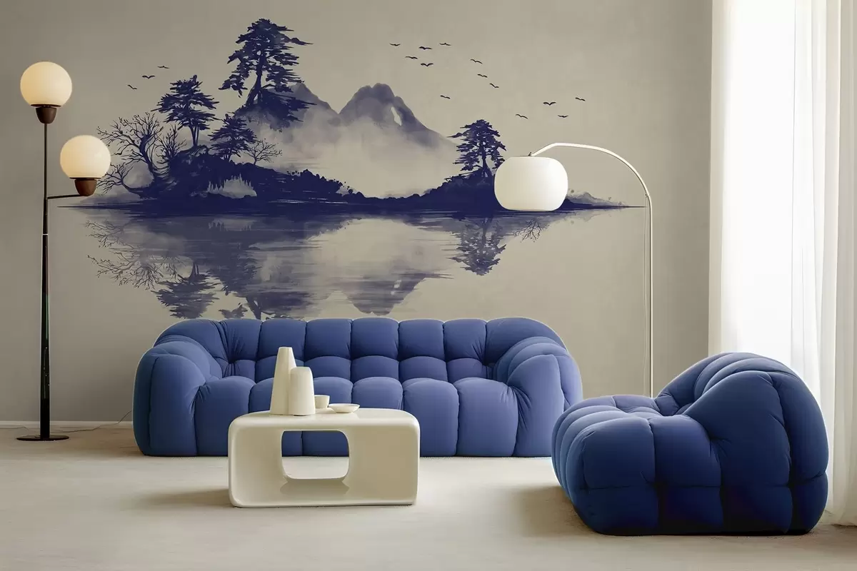Stenske poslikave Gorska pokrajina v tehniki sumi-e v modrih odtenkih Št. w05124v2