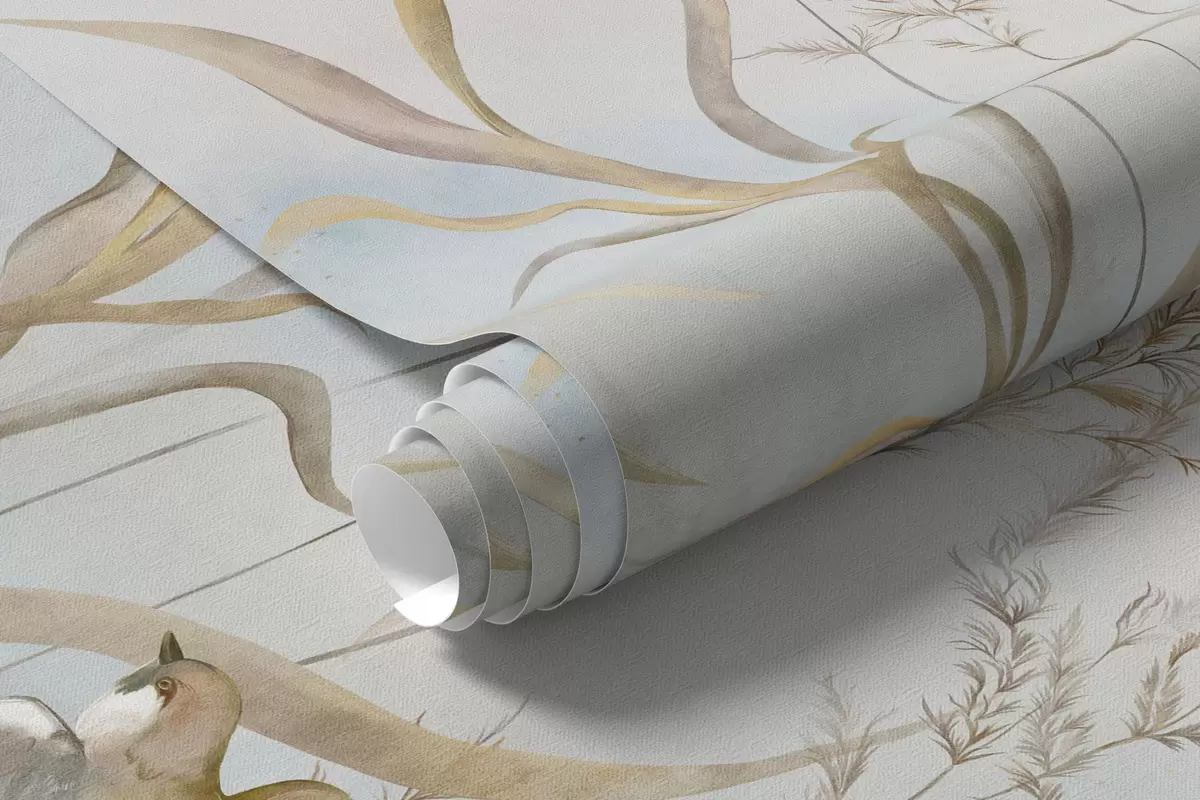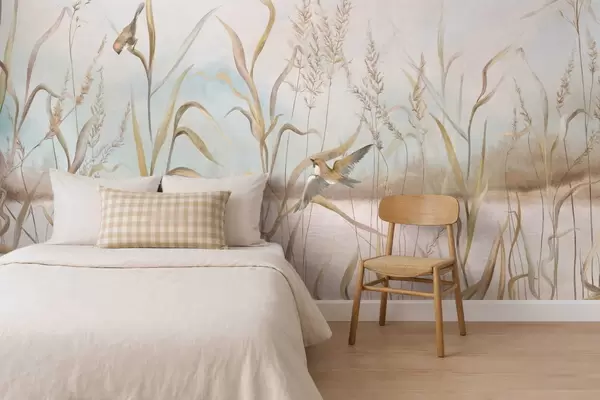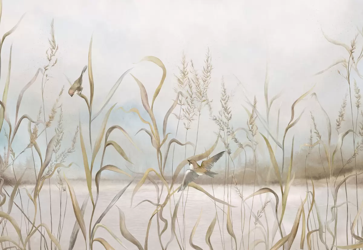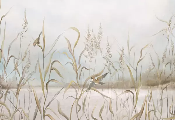 Stenske poslikave Ilustracija trstja in ptic ob vodi v nežnih barvah Št. w05125