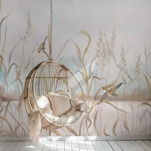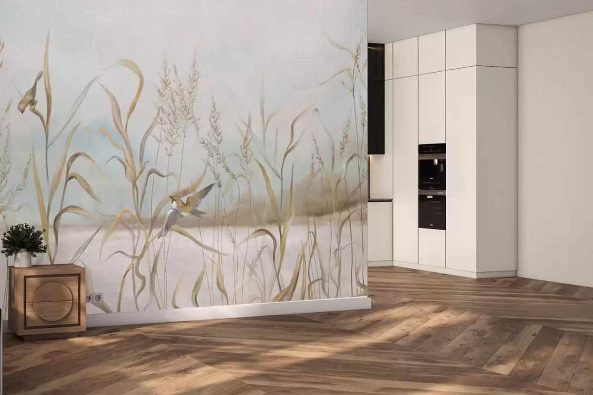 Stenske poslikave Ilustracija trstja in ptic ob vodi v nežnih barvah Št. w05125