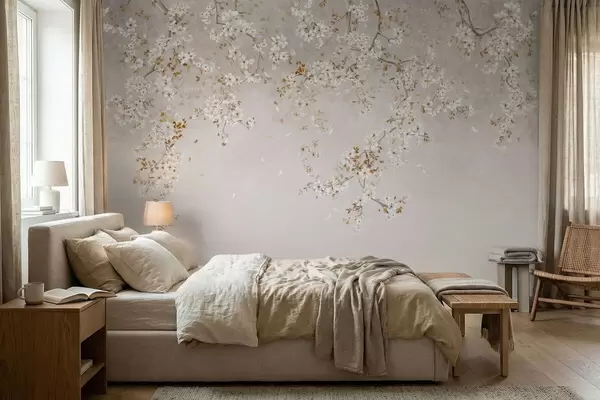 Stenske poslikave Vejice z belimi cvetovi na nežnem bežnem ozadju Št. w05129