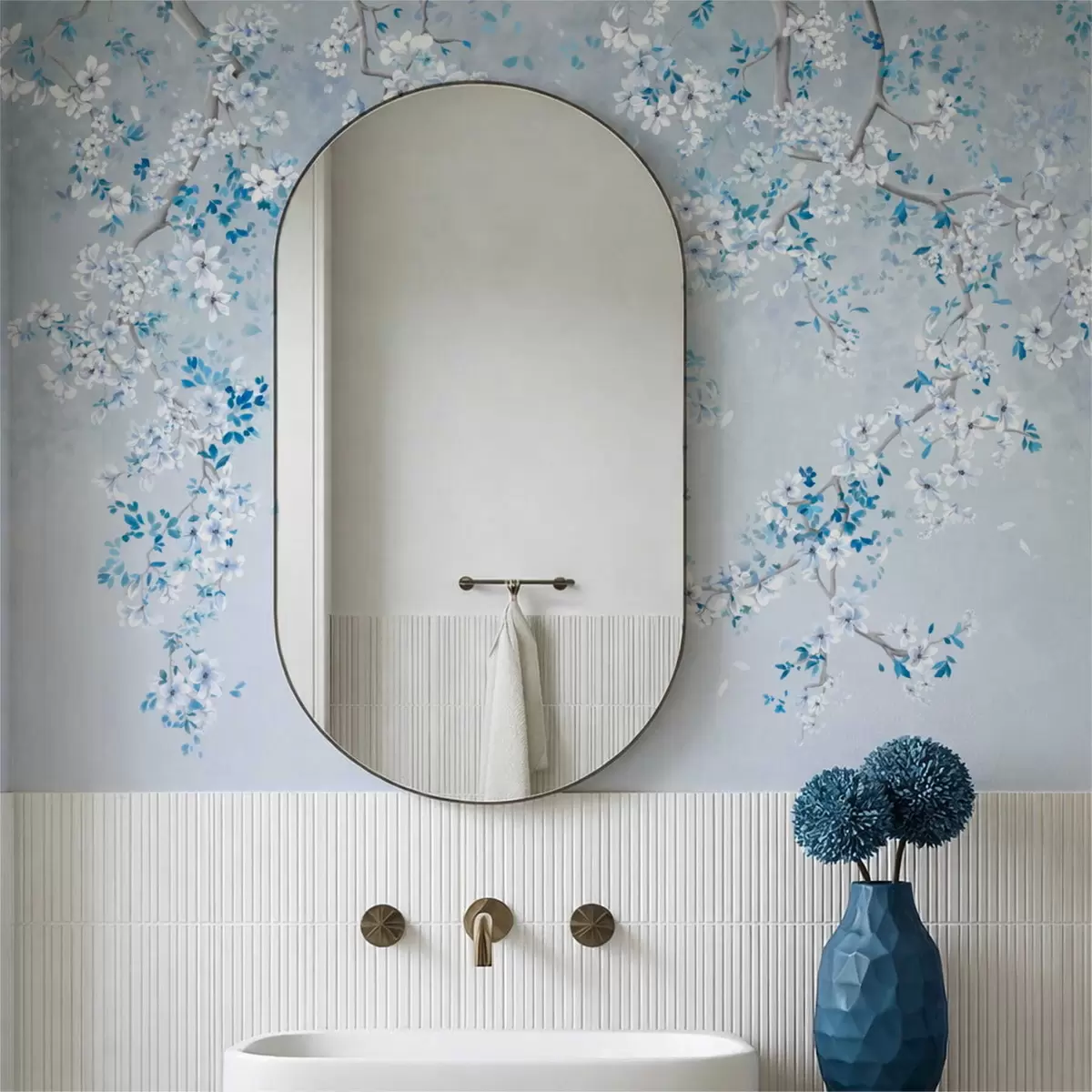 Stenske poslikave Vejice z belimi in modrimi cvetovi na hladnem ozadju Št. w05129v2