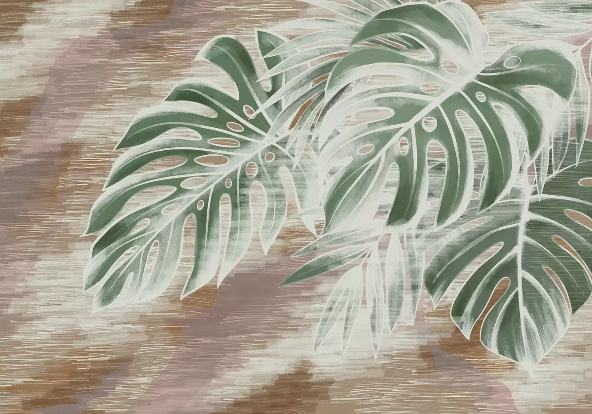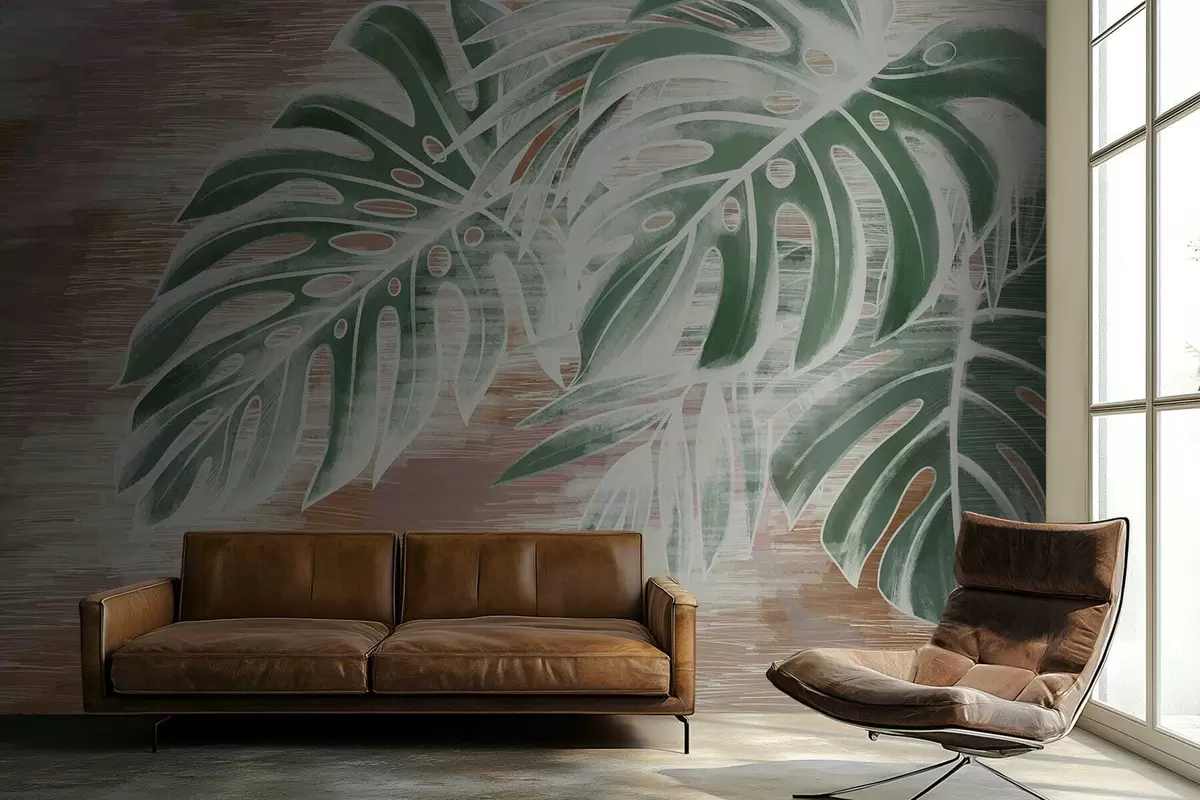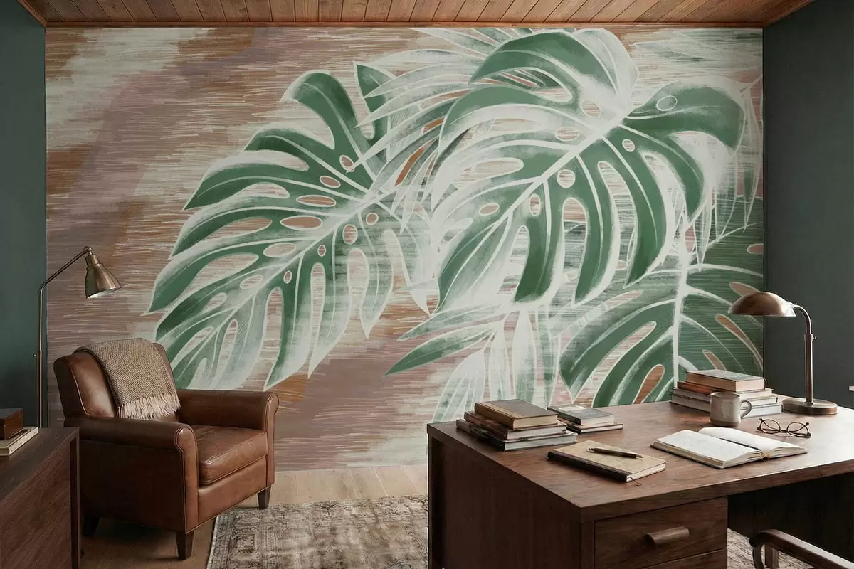 Stenske poslikave Zelene liste na topli teksturirani abstraktni podlagi Št. w05130v3
