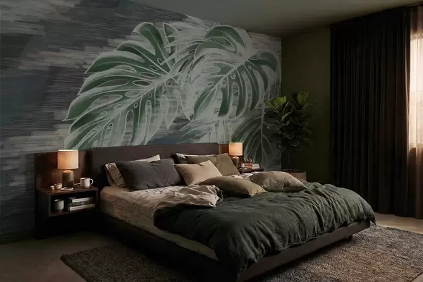 Stenske poslikave Temno zelene liste na teksturiranem temnem ozadju Št. w05130v4