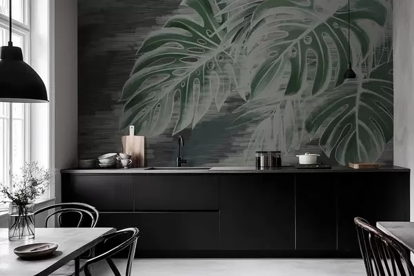Stenske poslikave Temno zelene liste na teksturiranem temnem ozadju Št. w05130v4