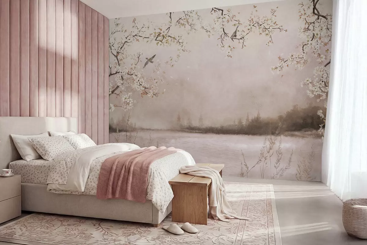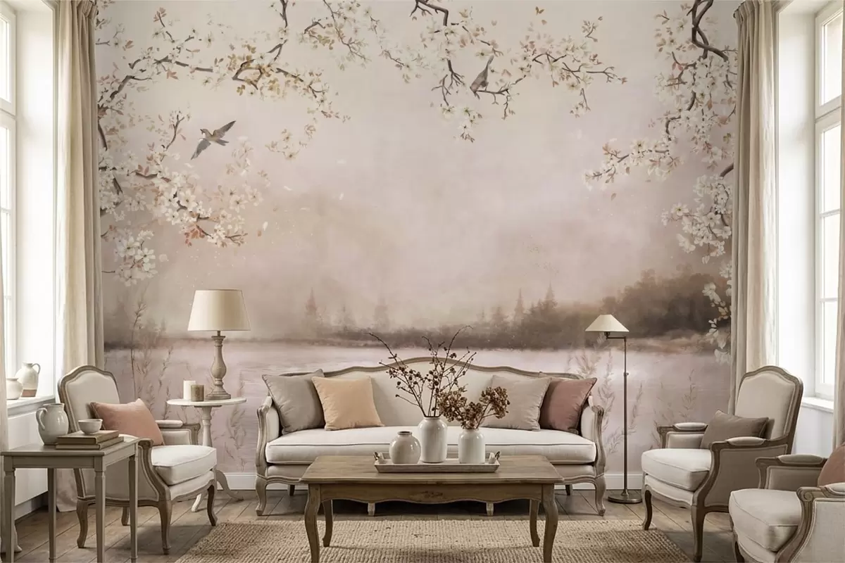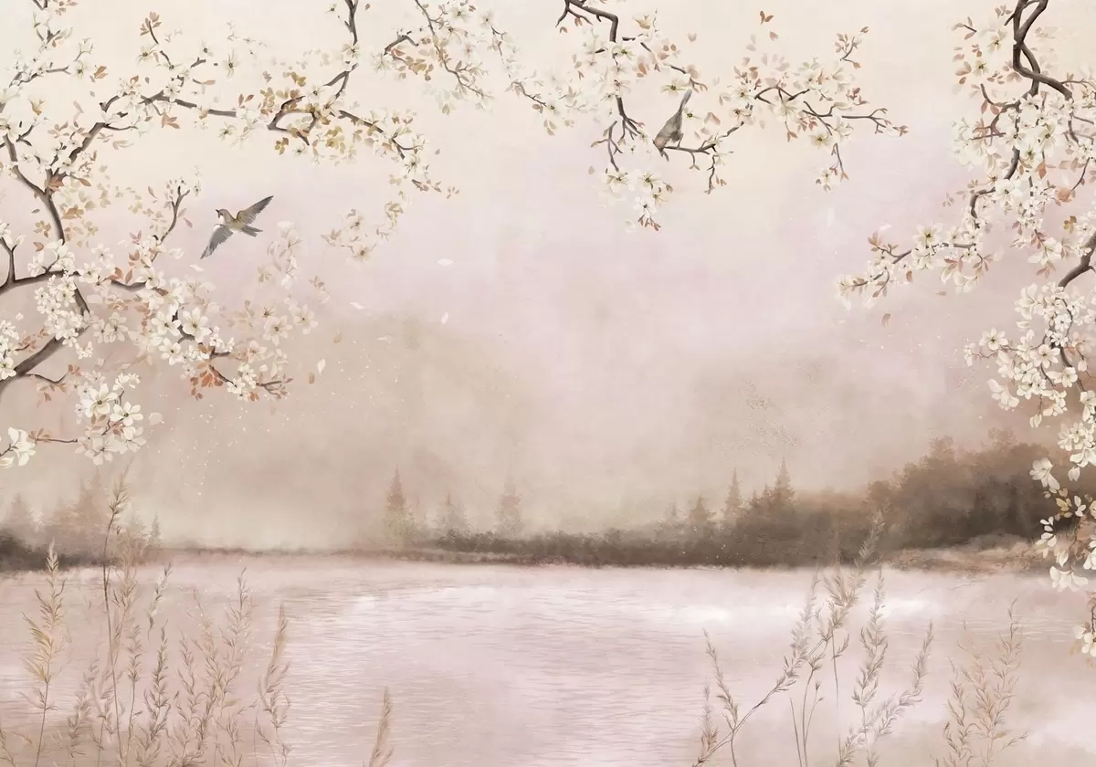 Stenske poslikave Cvetoče veje nad mirnim jezerom z pticami v megli Št. w05155v1