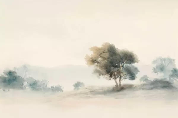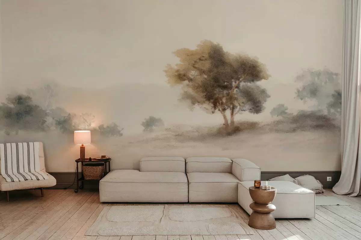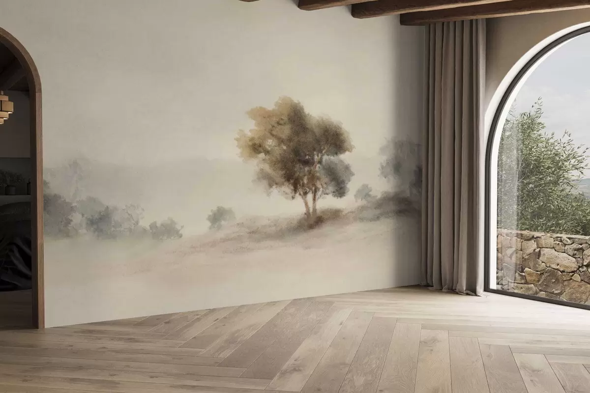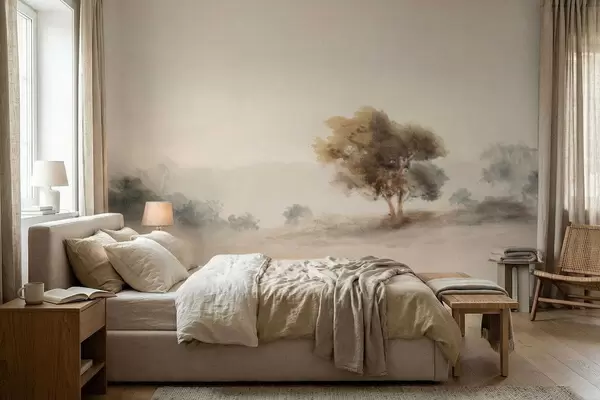 Stenske poslikave Minimalistična pokrajina z osamljenim drevesom v megli Št. w05223