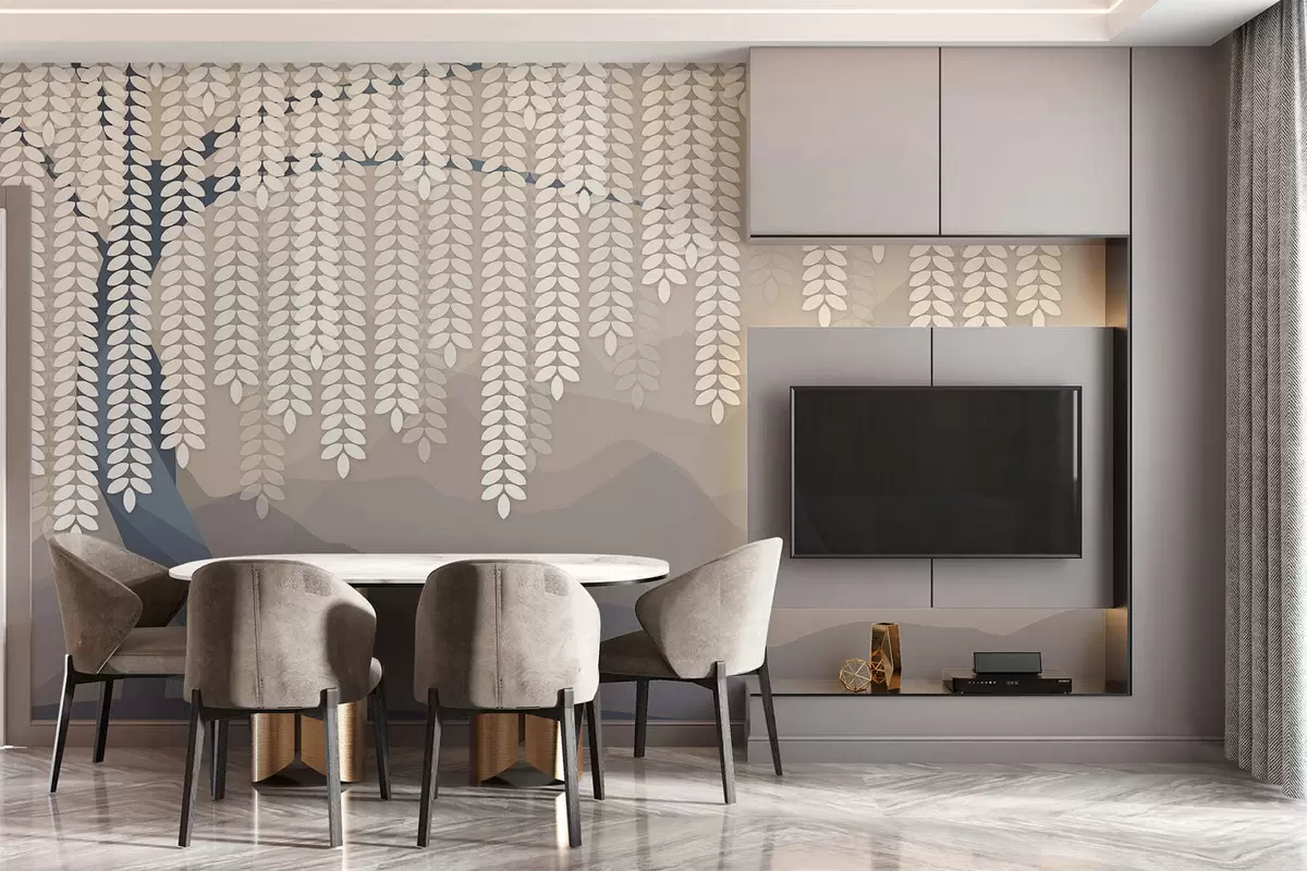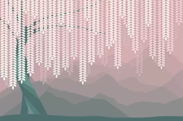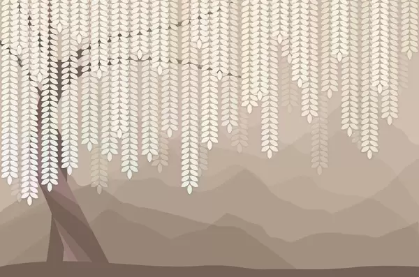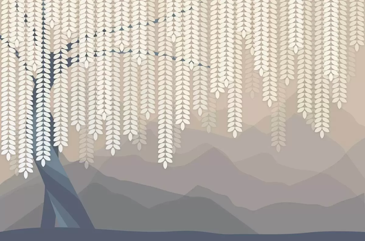 Stenske poslikave stilizirana vrba z visečimi listi na ozadju minimalističnih gora v odtenkih bež in modro-zelene barve Št. w05232