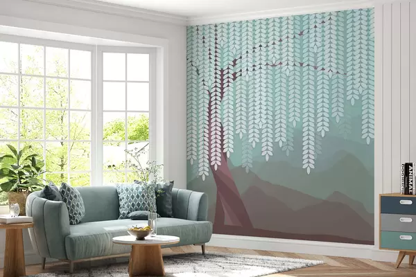 Stenske poslikave stilizirana vrba z visečimi listi na ozadju minimalističnih gora v odtenkih čokolade in turkizne barve Št. w05232v1
