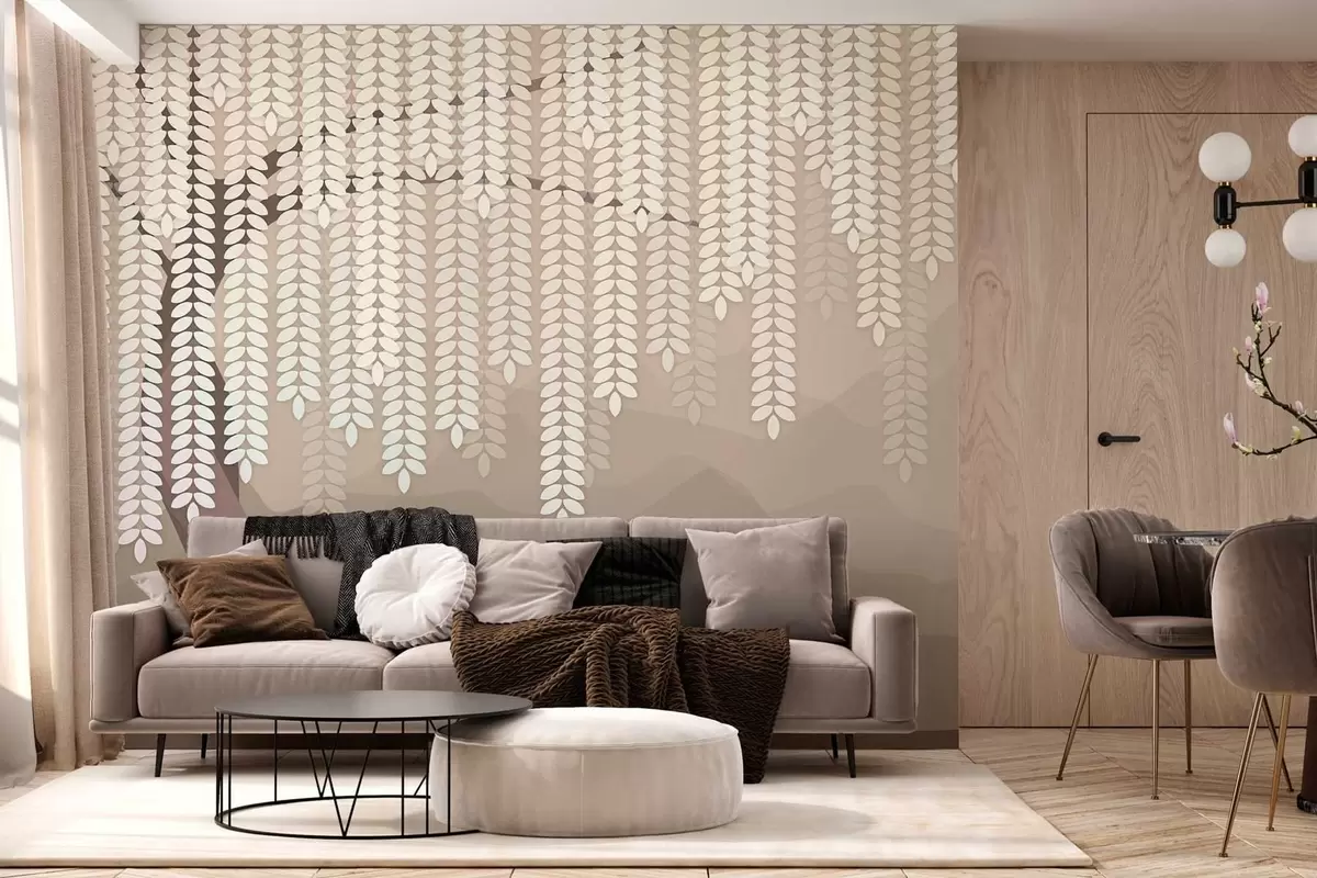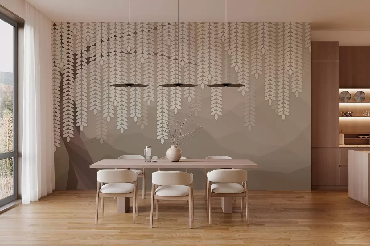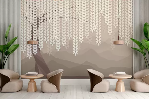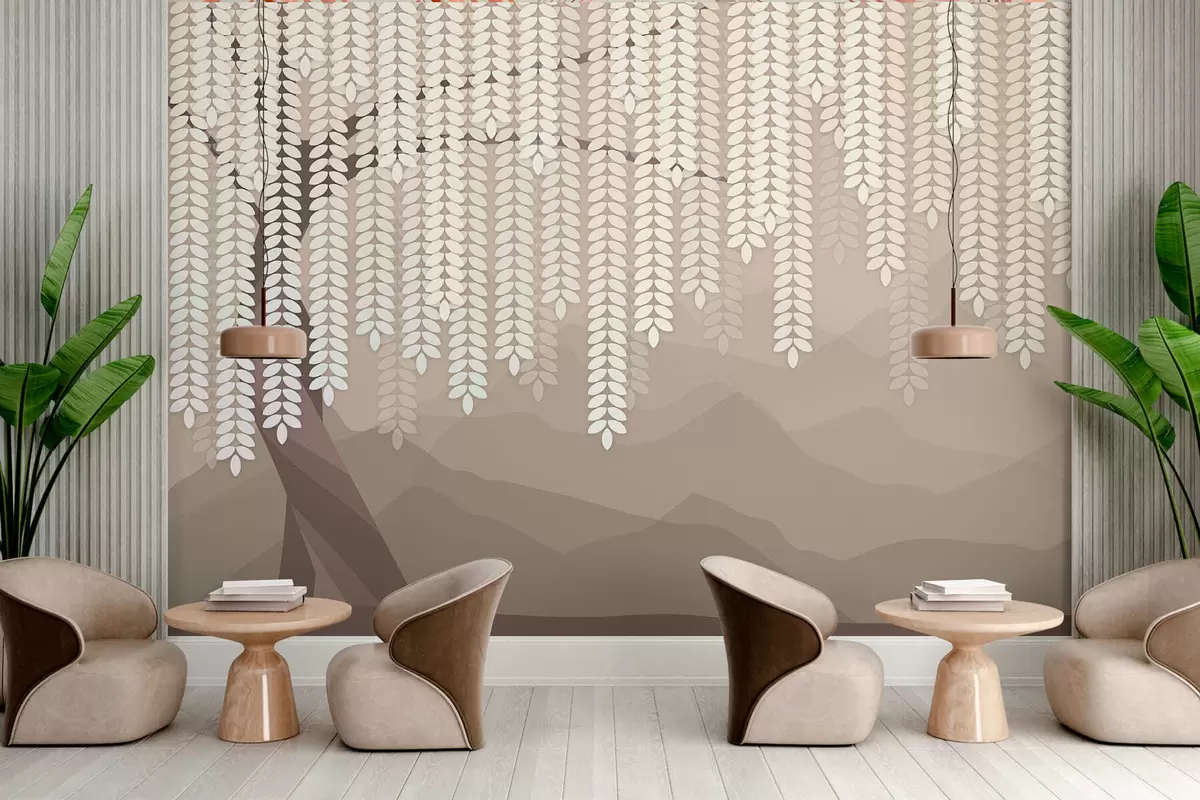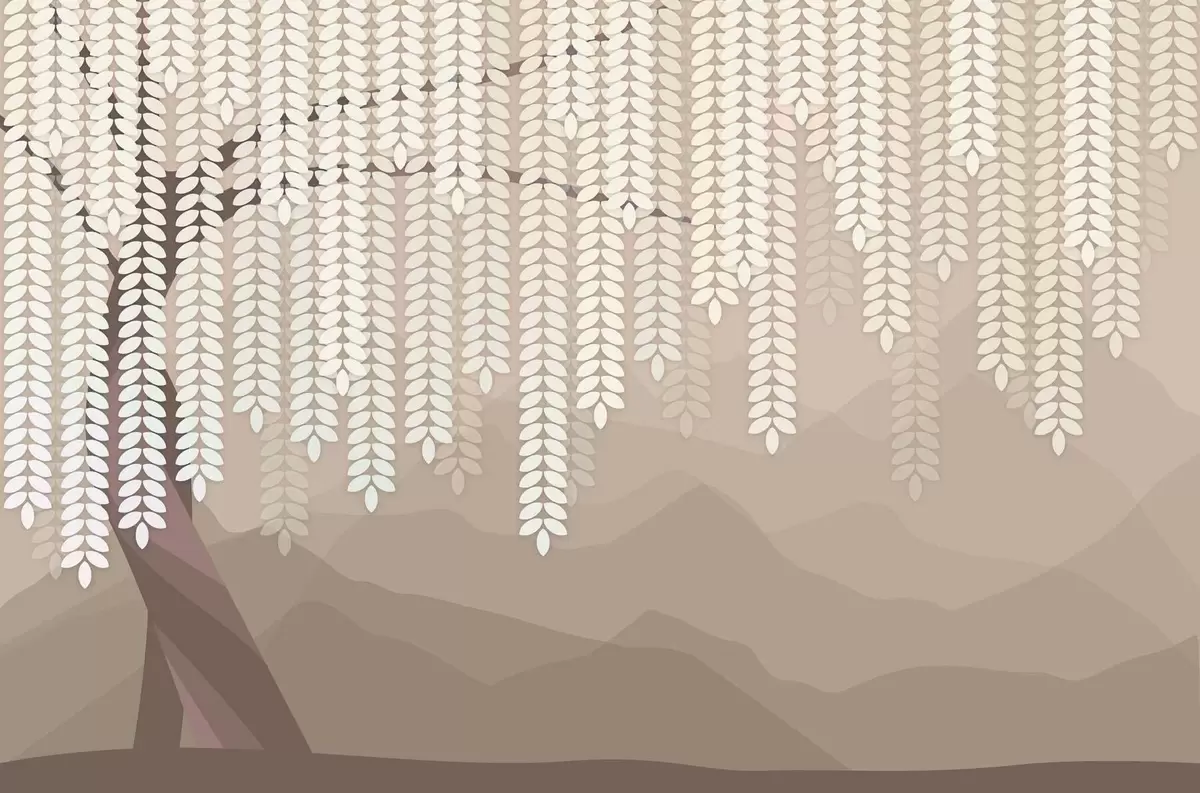 Stenske poslikave stilizirana vrba z visečimi listi na ozadju minimalističnih gora v odtenkih kave Št. w05232v2