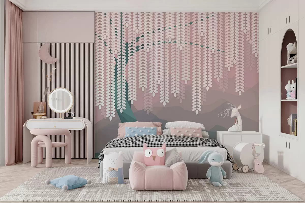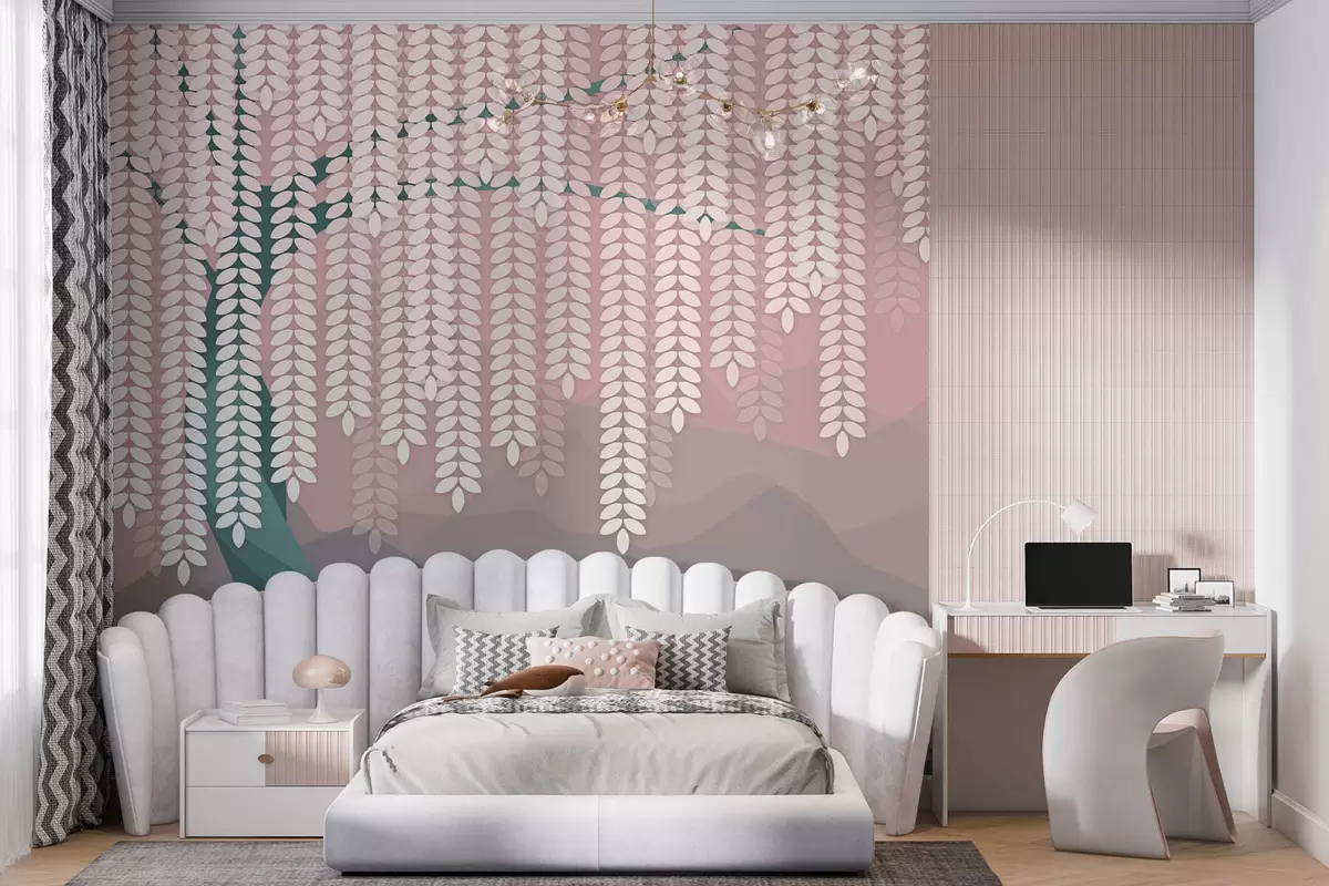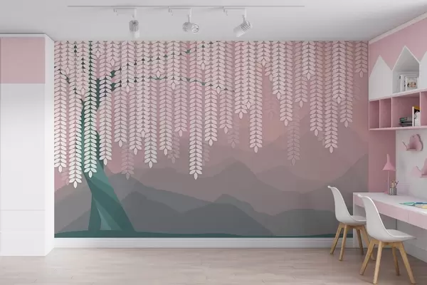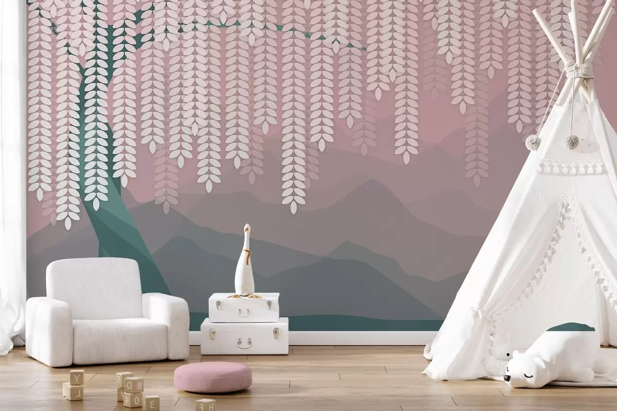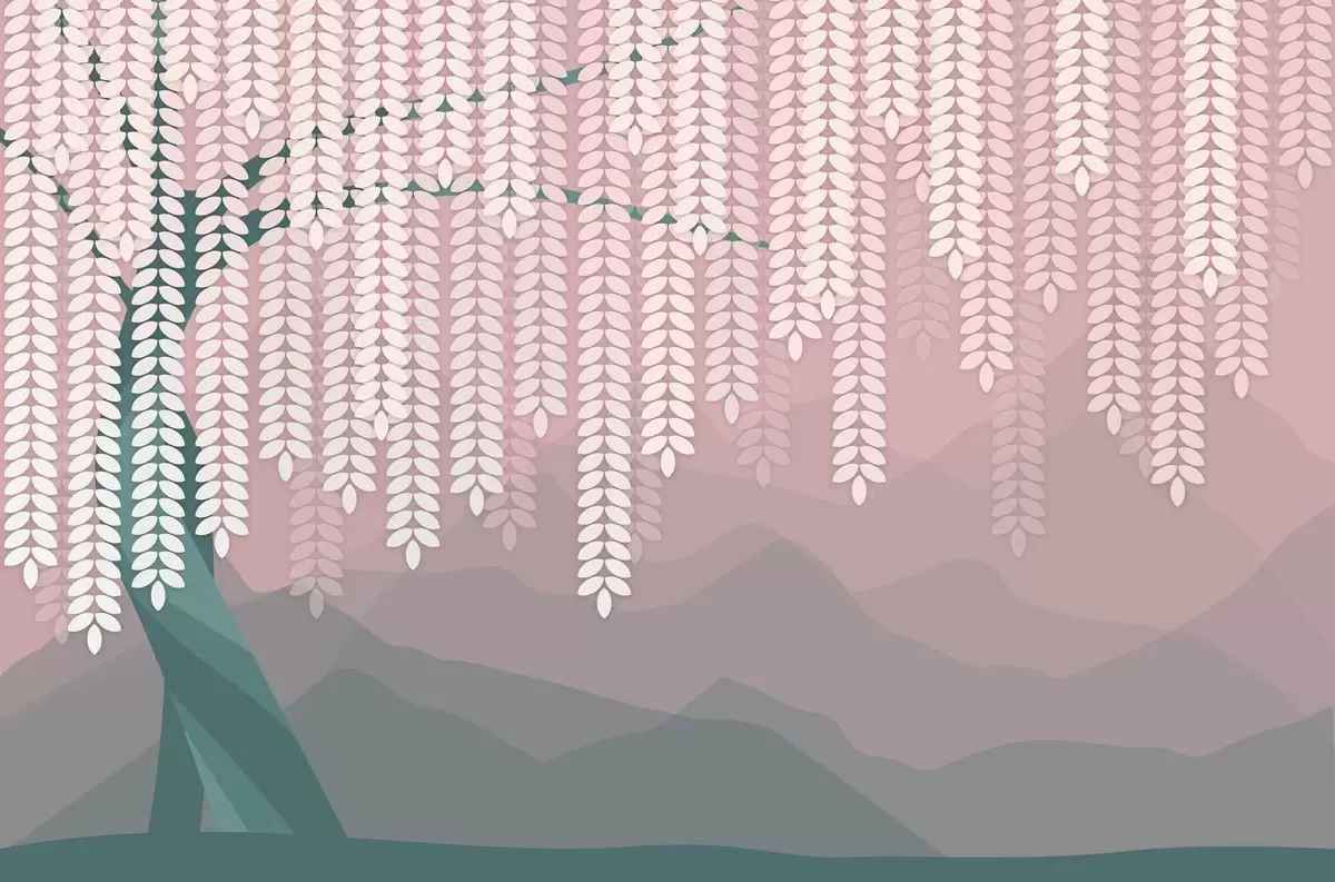 Stenske poslikave stilizirana vrba z visečimi listi na ozadju minimalističnih gora v odtenkih rožnate in temno zelene barve Št. w05232v4