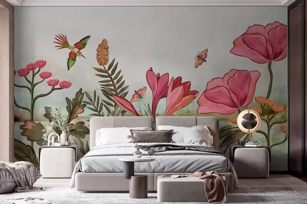 Stenske poslikave Svetle cvetlice s pticami in metulji Št. w05321