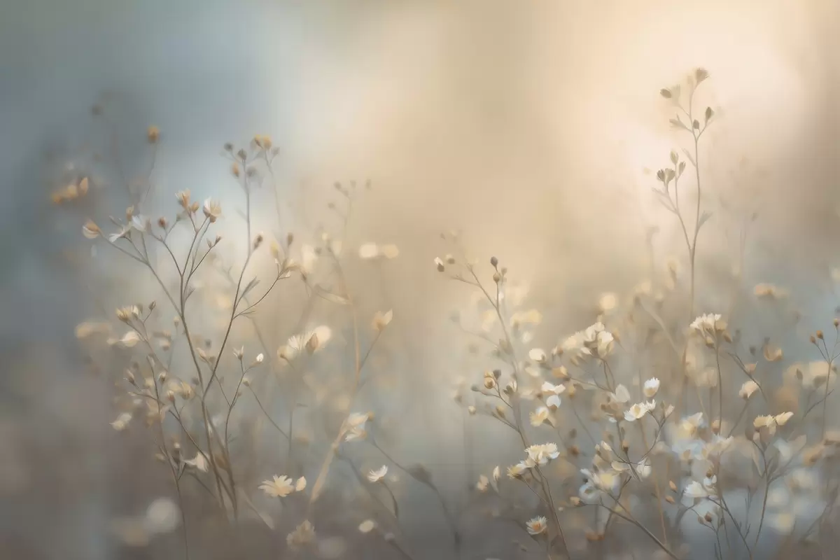Stenske poslikave poljske trave z drobnimi cvetovi na ozadju plitve globinske ostrine Št. w05386