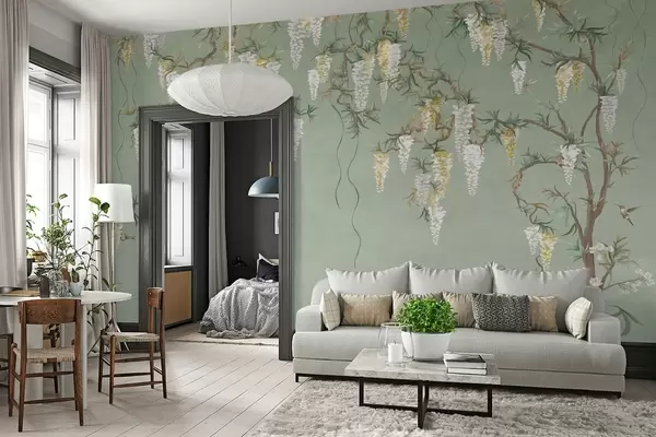 Stenske poslikave Cvetoče veje z belimi cvetovi in pticami na zelenem ozadju Št. w05394