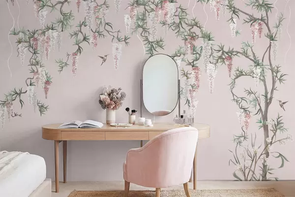 Stenske poslikave Cvetoče veje z rožnatimi cvetovi in pticami Št. w05394v1