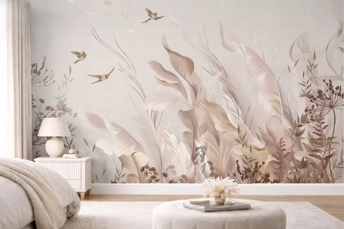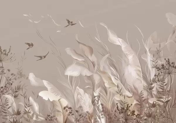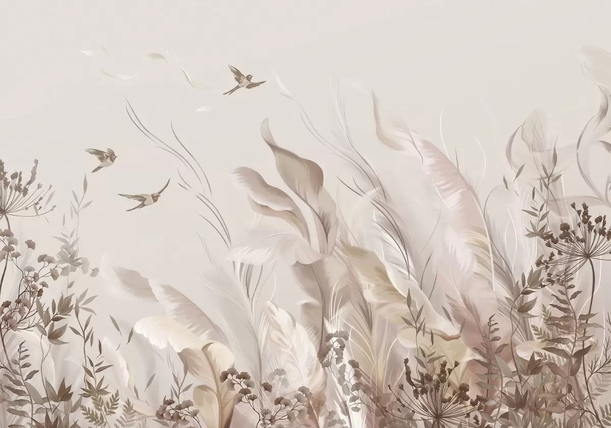 Stenske poslikave Mehka perja, trave in ptice v svetlih odtenkih Št. w05395