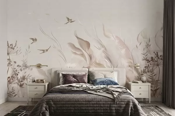 Stenske poslikave Mehka perja, trave in ptice v svetlih odtenkih Št. w05395
