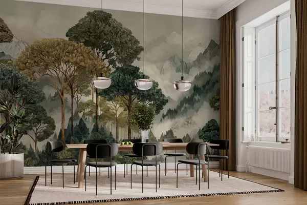Stenske poslikave Gozd z visokimi drevesi v meglenih gorah Št. w05410