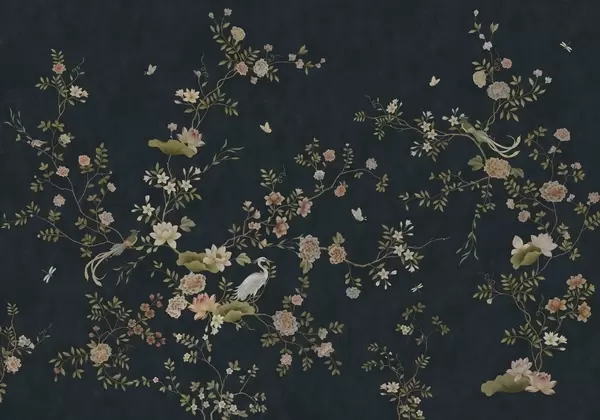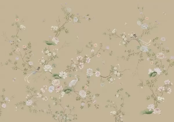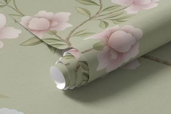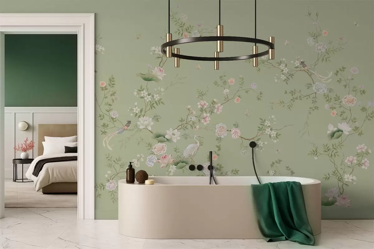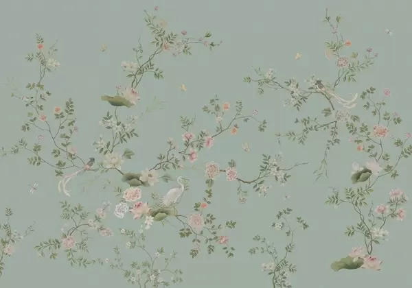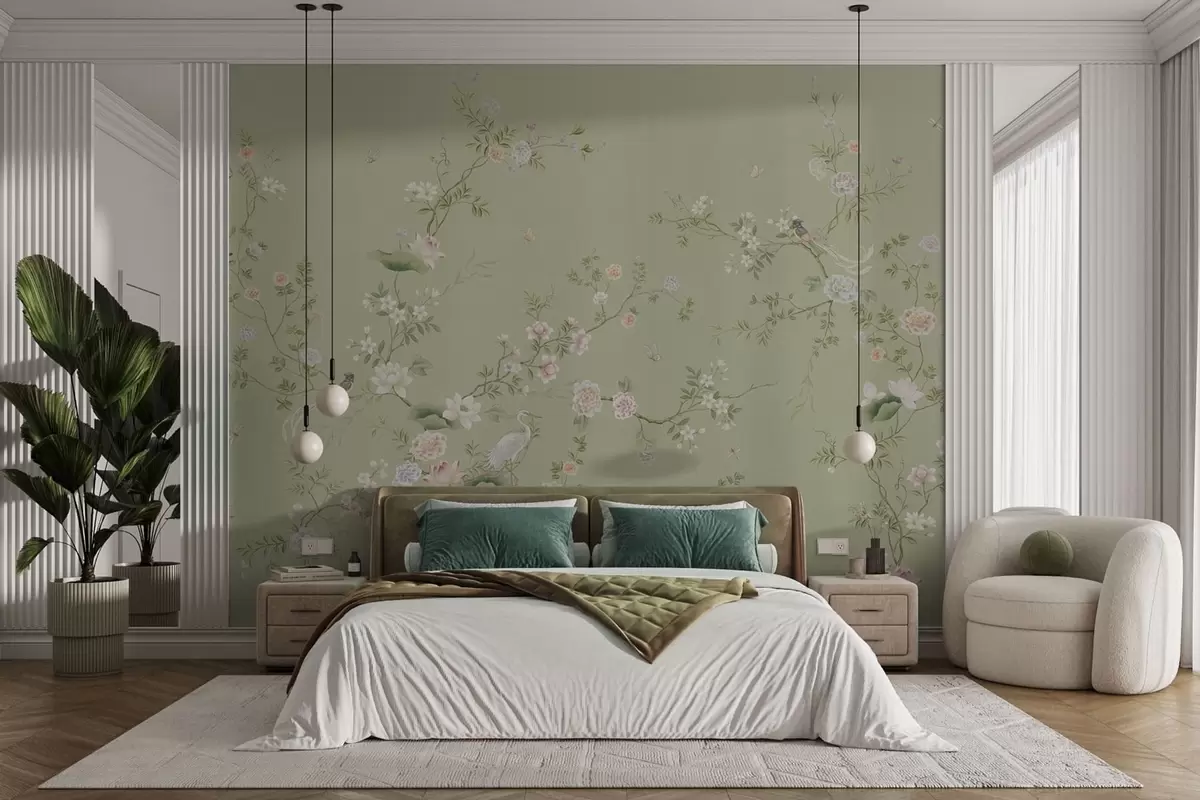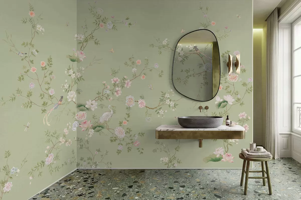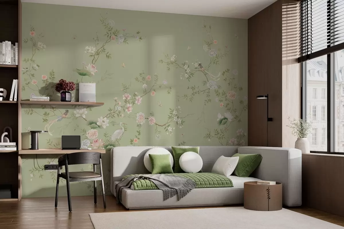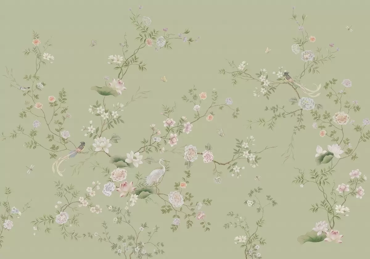 Stenske poslikave Cvetoče veje s pticami na svetlo zelenem ozadju Št. w05416