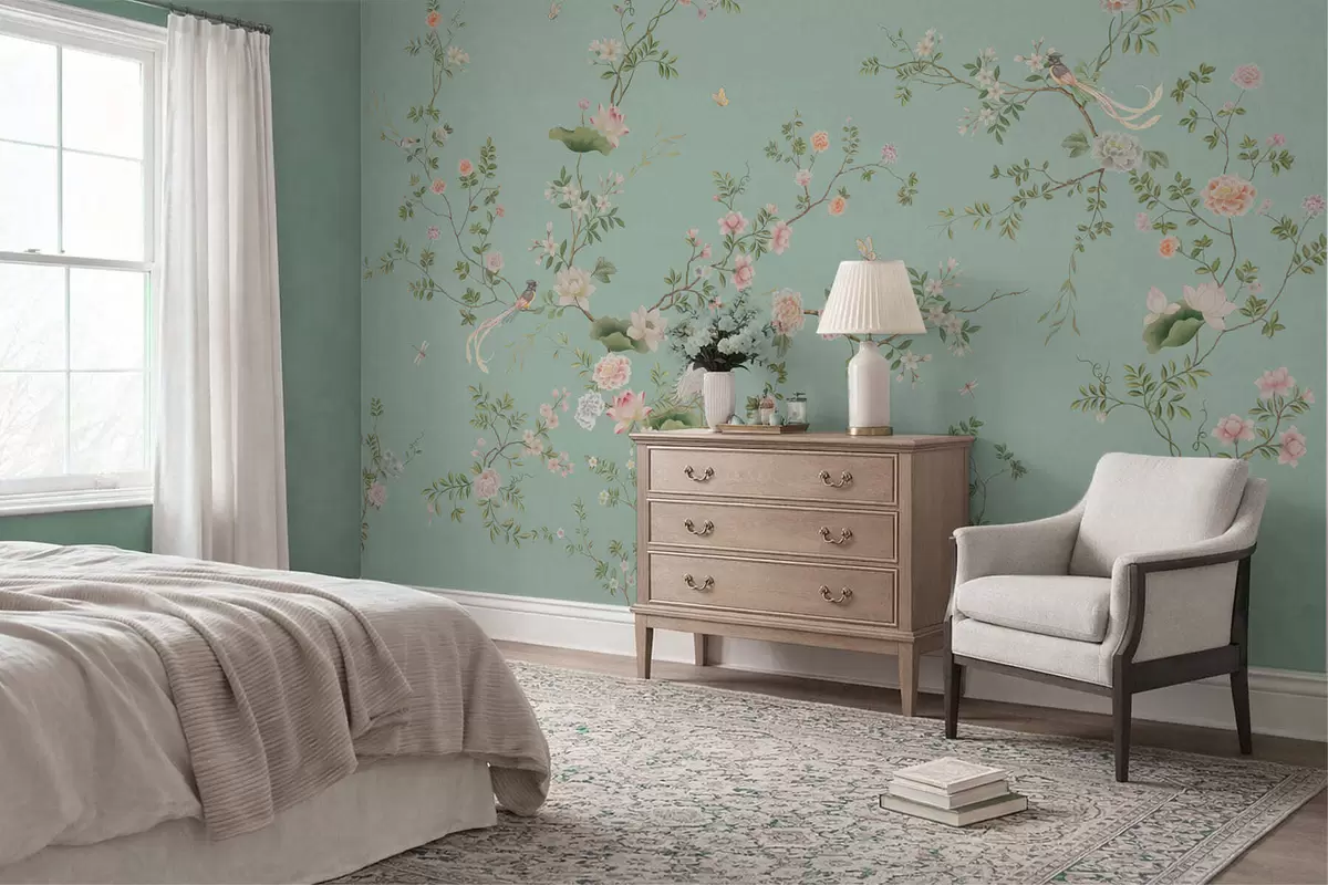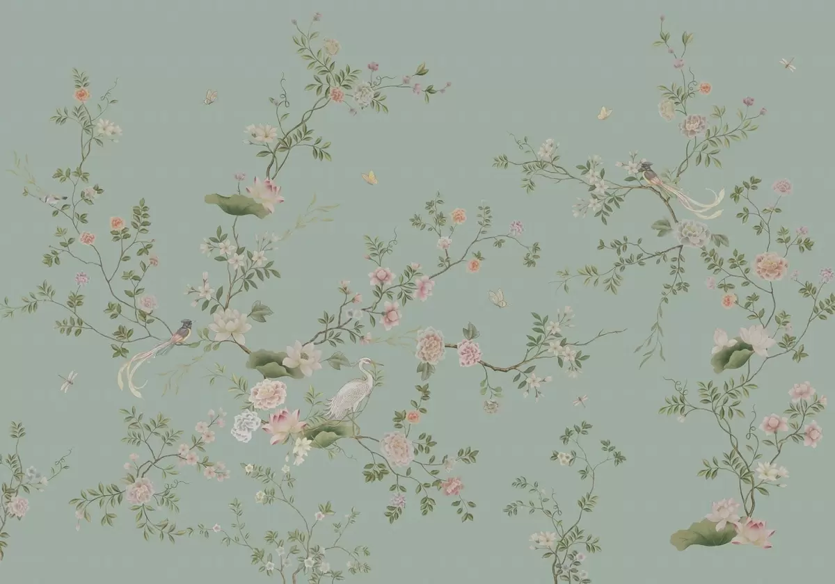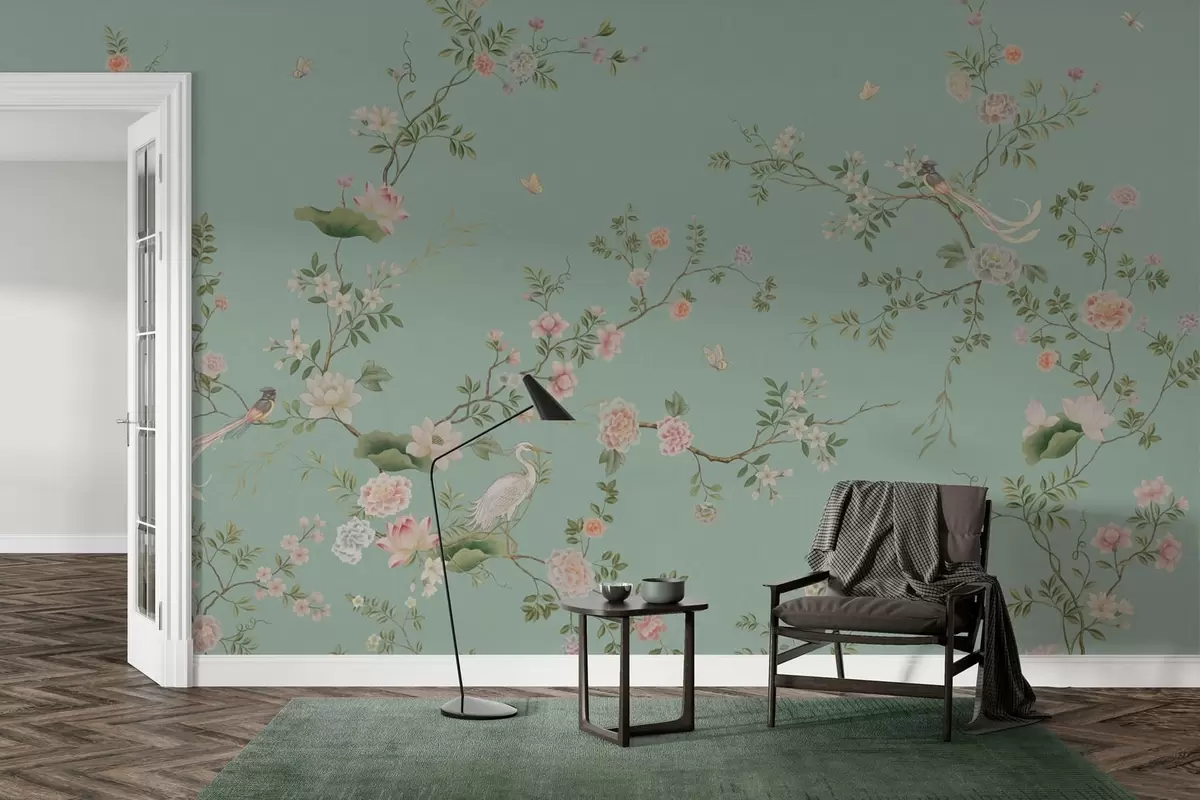 Stenske poslikave Cvetoče veje s pticami na modrem ozadju Št. w05416v1