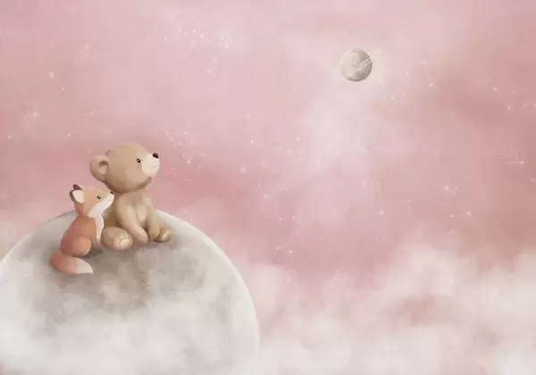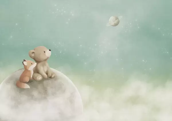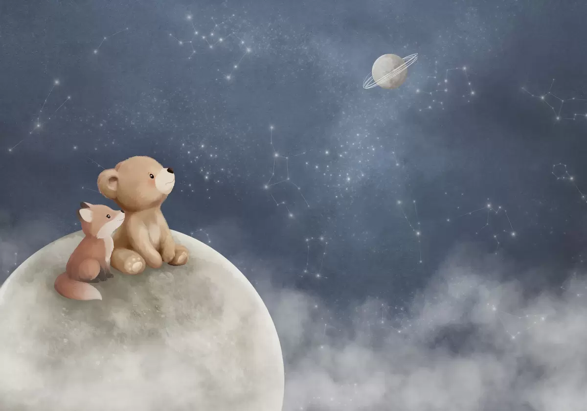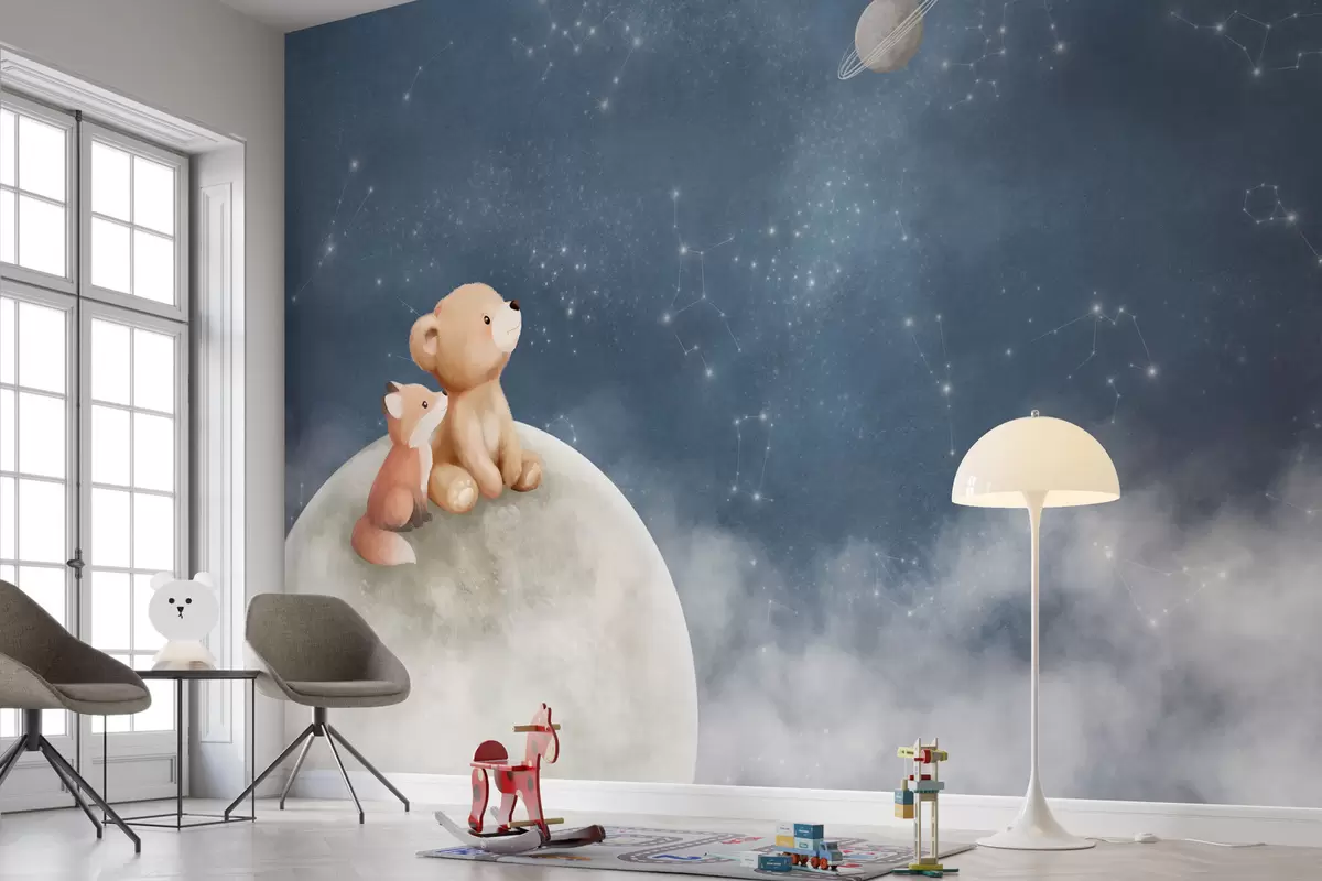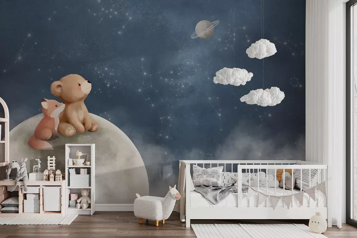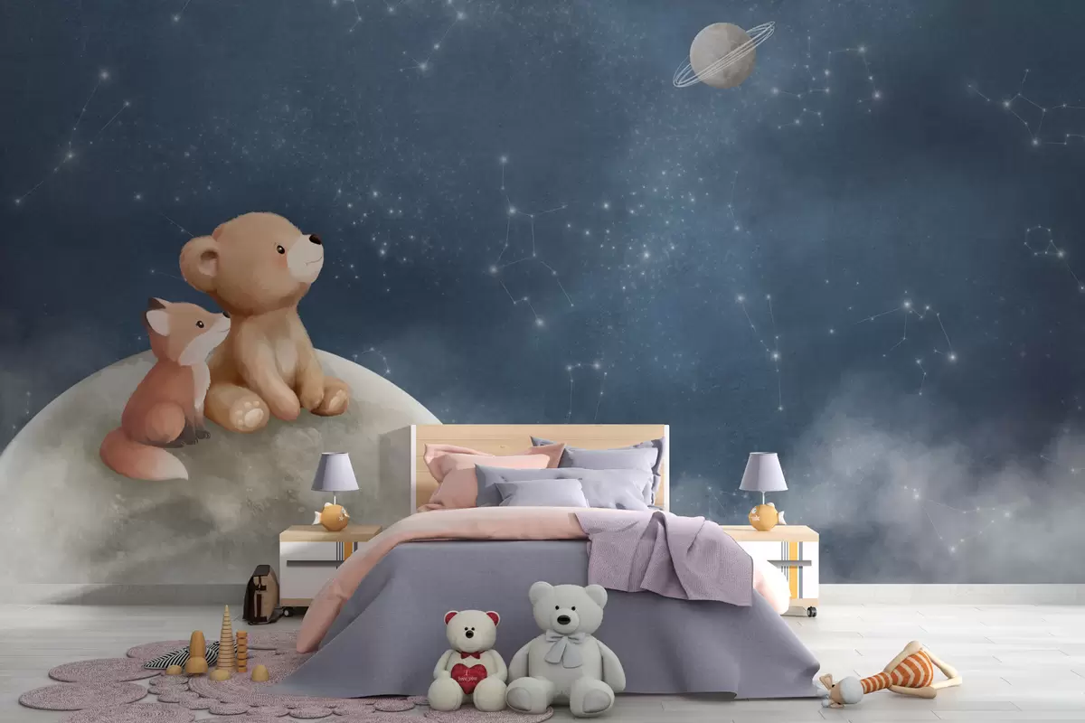 Stenske poslikave Pastelna ilustracija medveda in lisice pod nočnim nebom Št. w05431