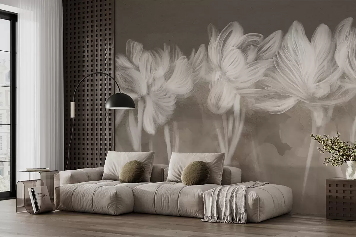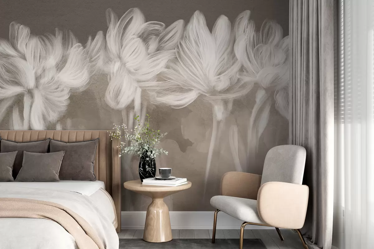 Stenske poslikave Mehke minimalistične bele prozorne cvetlične silhuete na rjavem teksturiranem ozadju Št. w07986