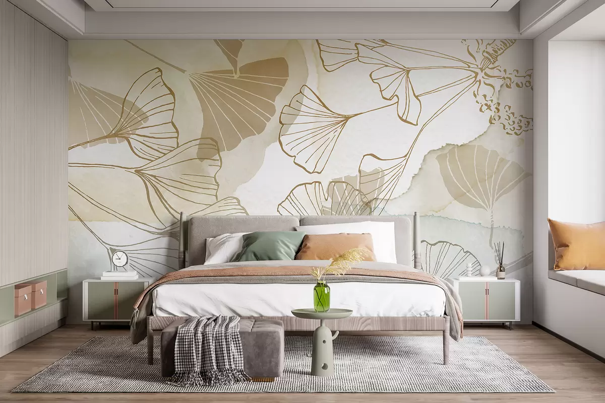 Stenske poslikave Vzorec nežnih listov ginka v odtenkih bež, rjave in modre na svetlem ozadju Št. w08157