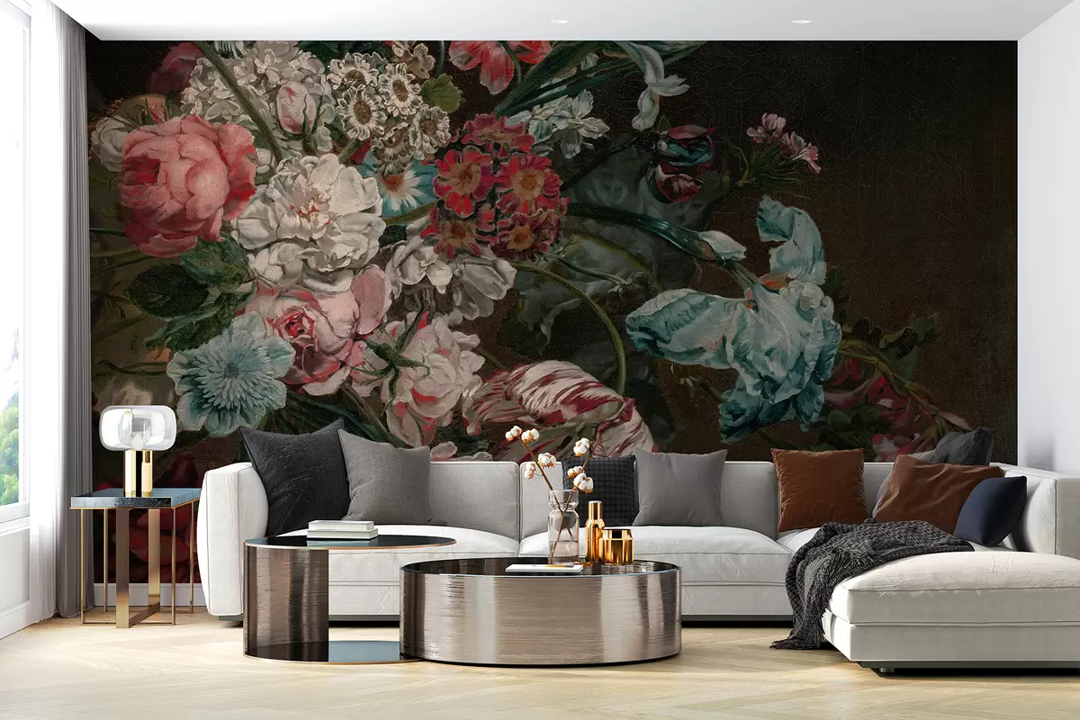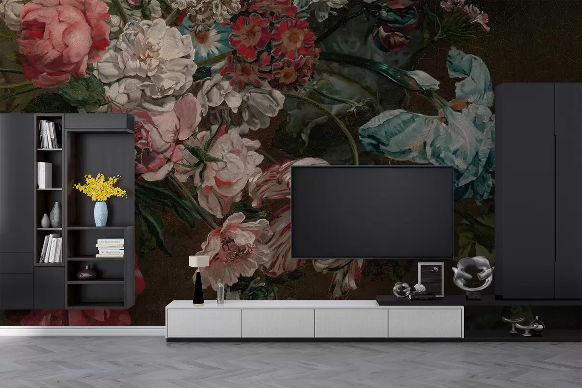 Stenske poslikave Vintage barvite rože, vključno z rožnatimi potonikami, rdečimi nageljni in belimi lilijami na temnem ozadju Št. w08163