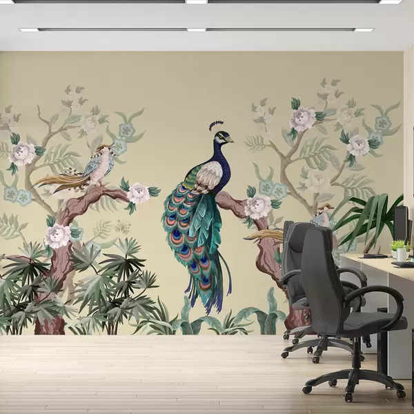 Stenske poslikave pav na drevesu, bež ozadje Št. w08168